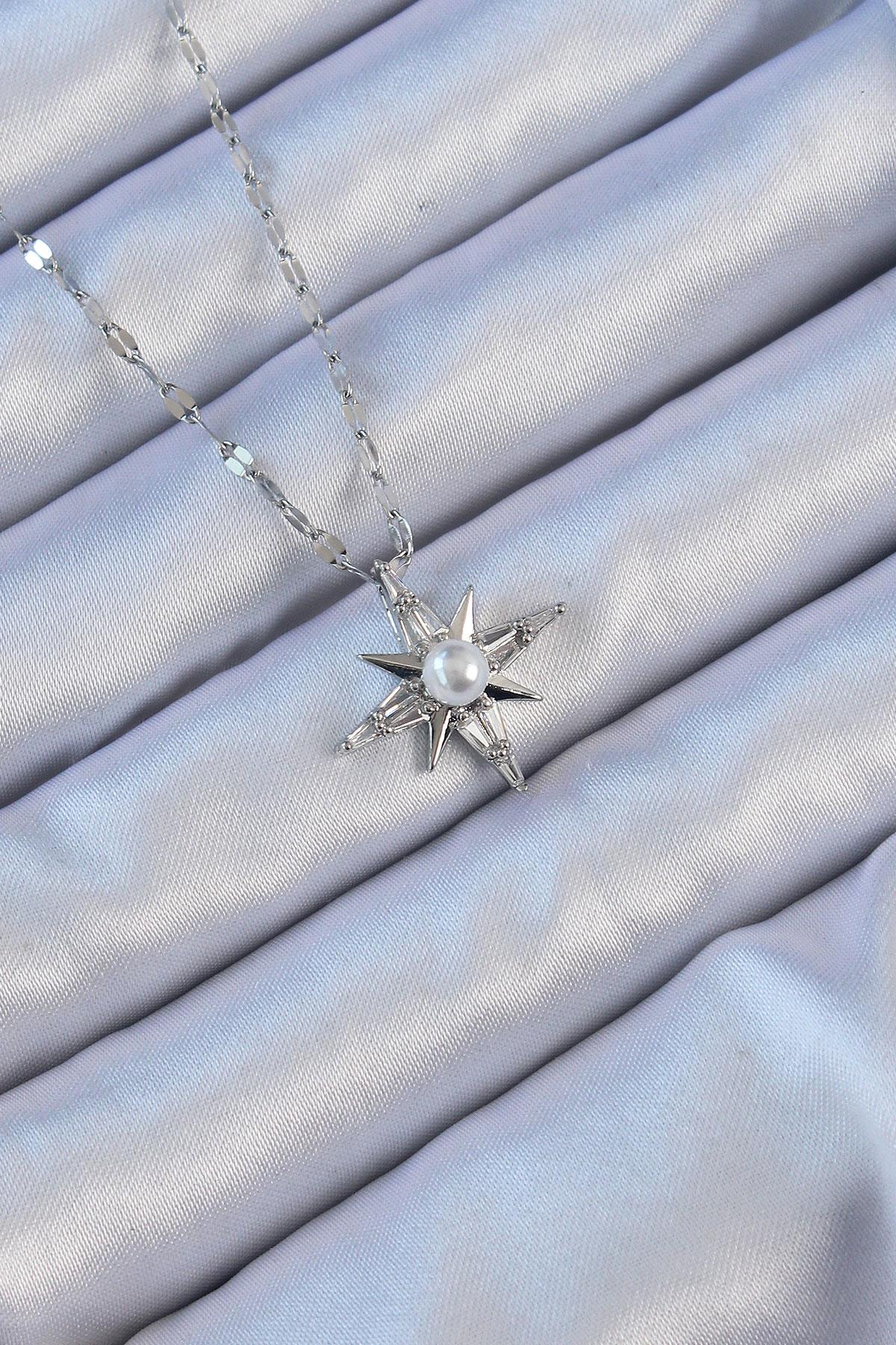 316L Çelik Zincir Gümüş Renk Baget Taşlı İnci Detay Kutup Yıldızı Kolye