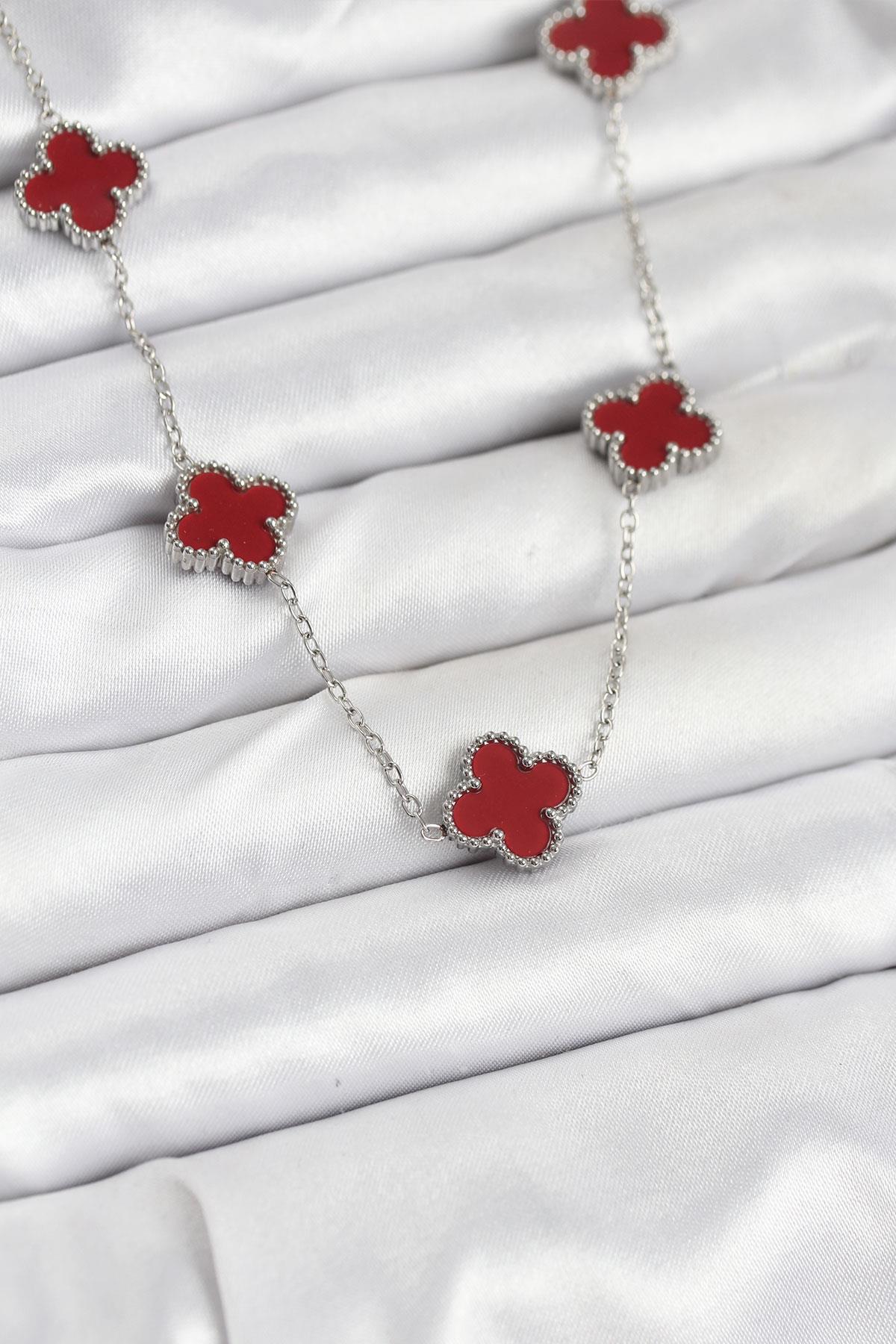 316L Çelik Zincir Gümüş Renk Bordo Renk Yonca Kadın Kolye