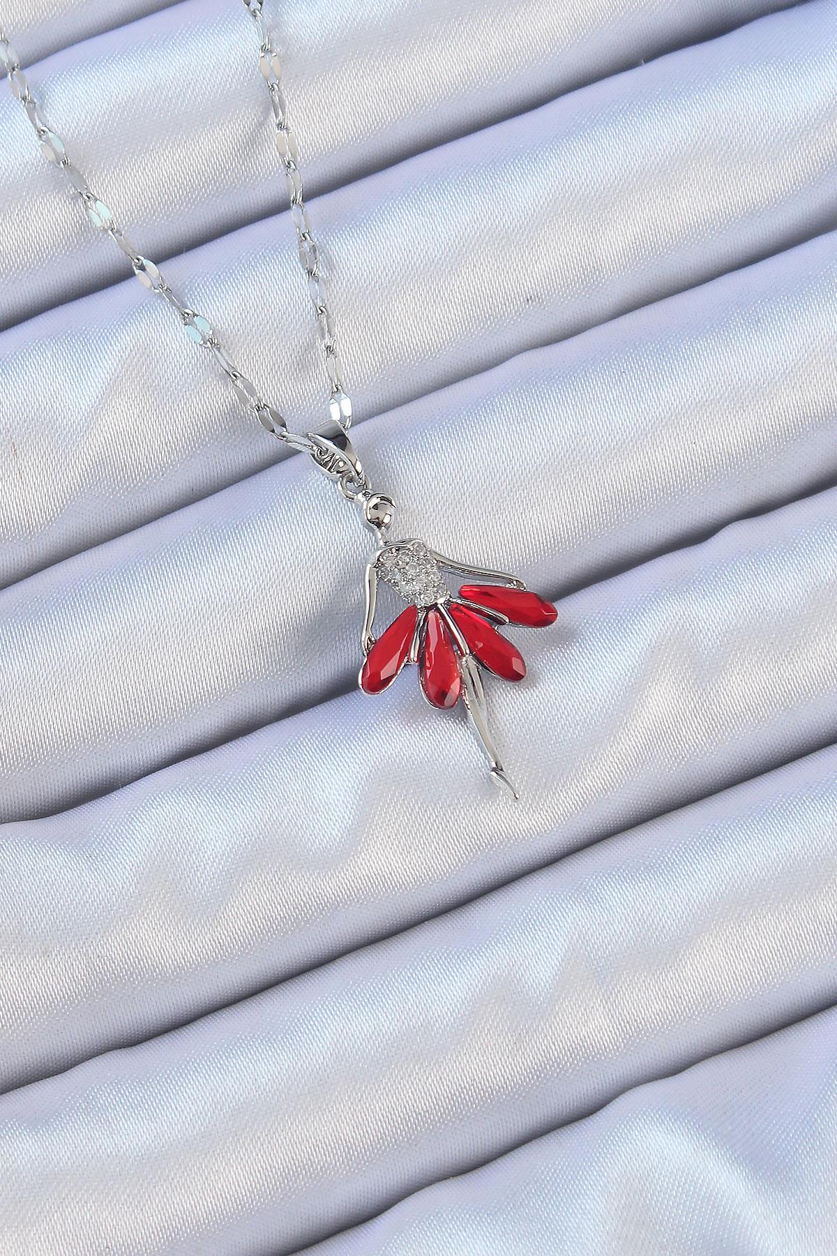 316L Çelik Zincir Gümüş Renk Kırmızı Etekli Zirkon Taşlı Balerin Kolye