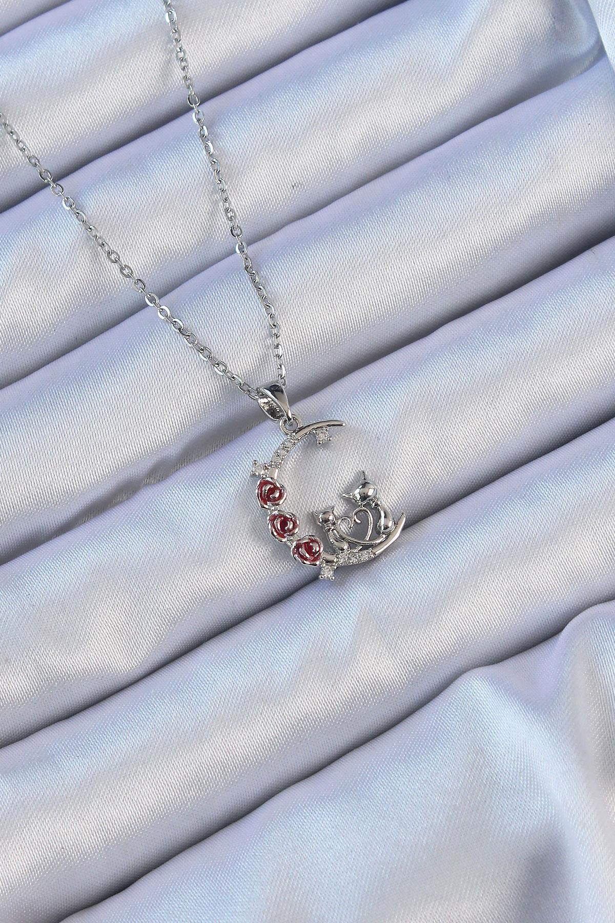 316L Çelik Zincir Gümüş Renk Kırmızı Gül Detay Kedi Figür Zirkon Taşlı Ay Kolye
