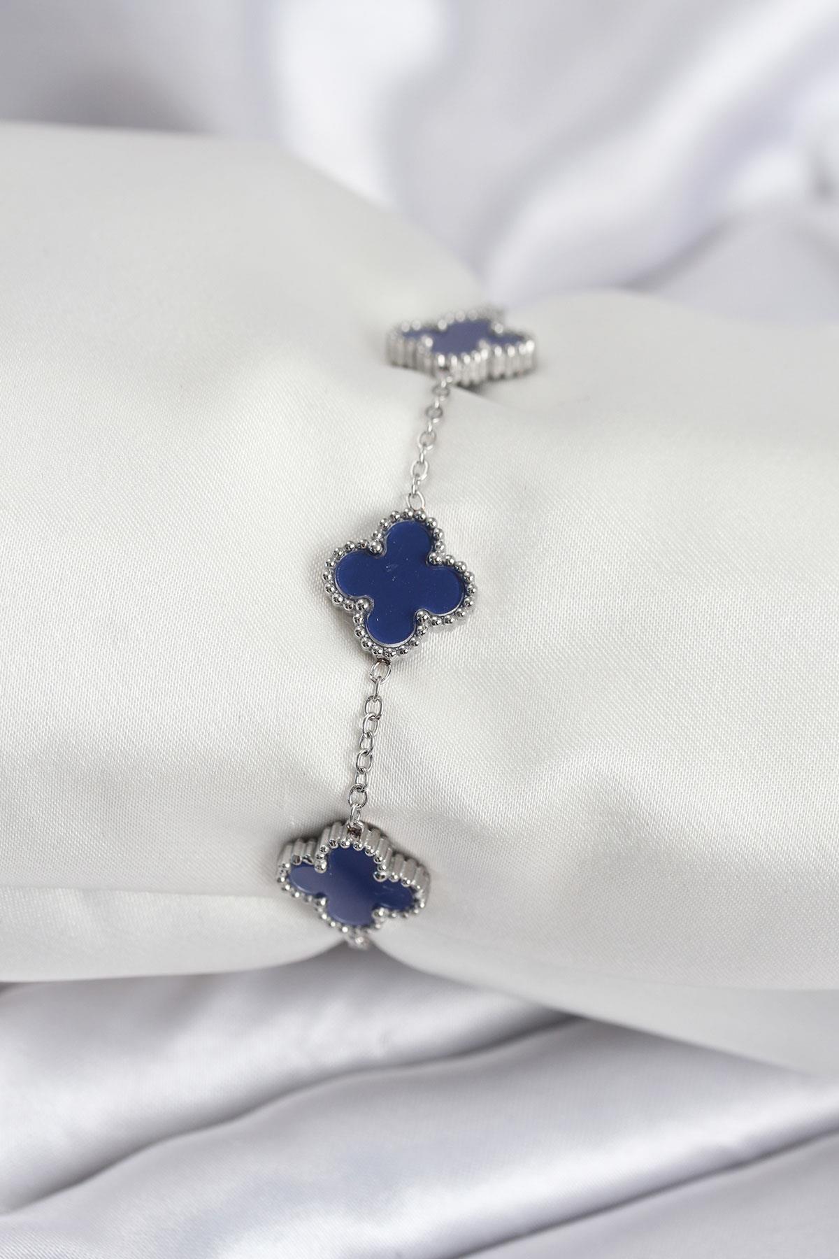 316L Çelik Zincir Gümüş Renk Lacivert Yonca Kadın Bileklik