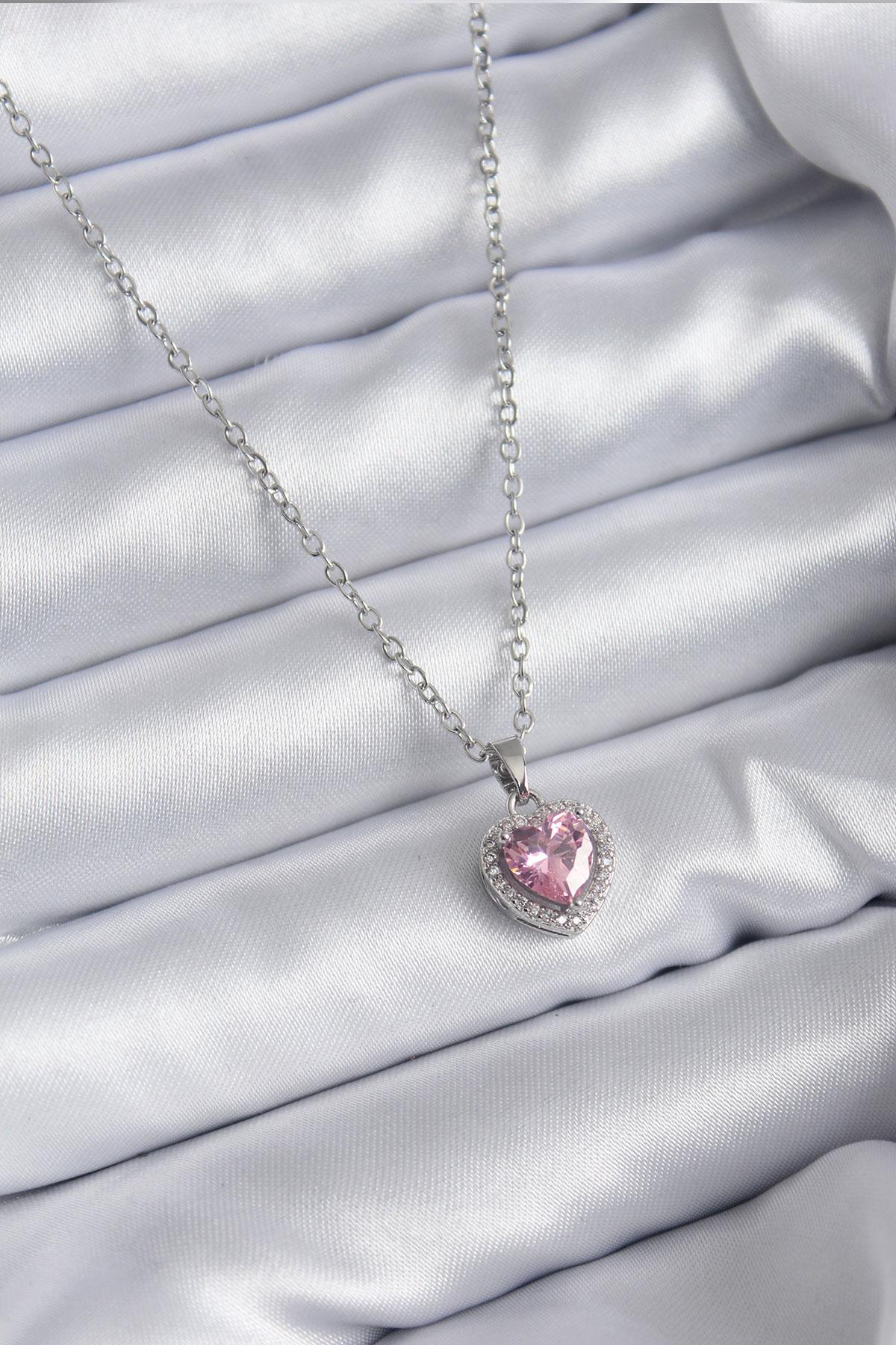 316L Çelik Zincir Gümüş Renk Pembe Zirkon Taş Charm Model Kadın Kolye