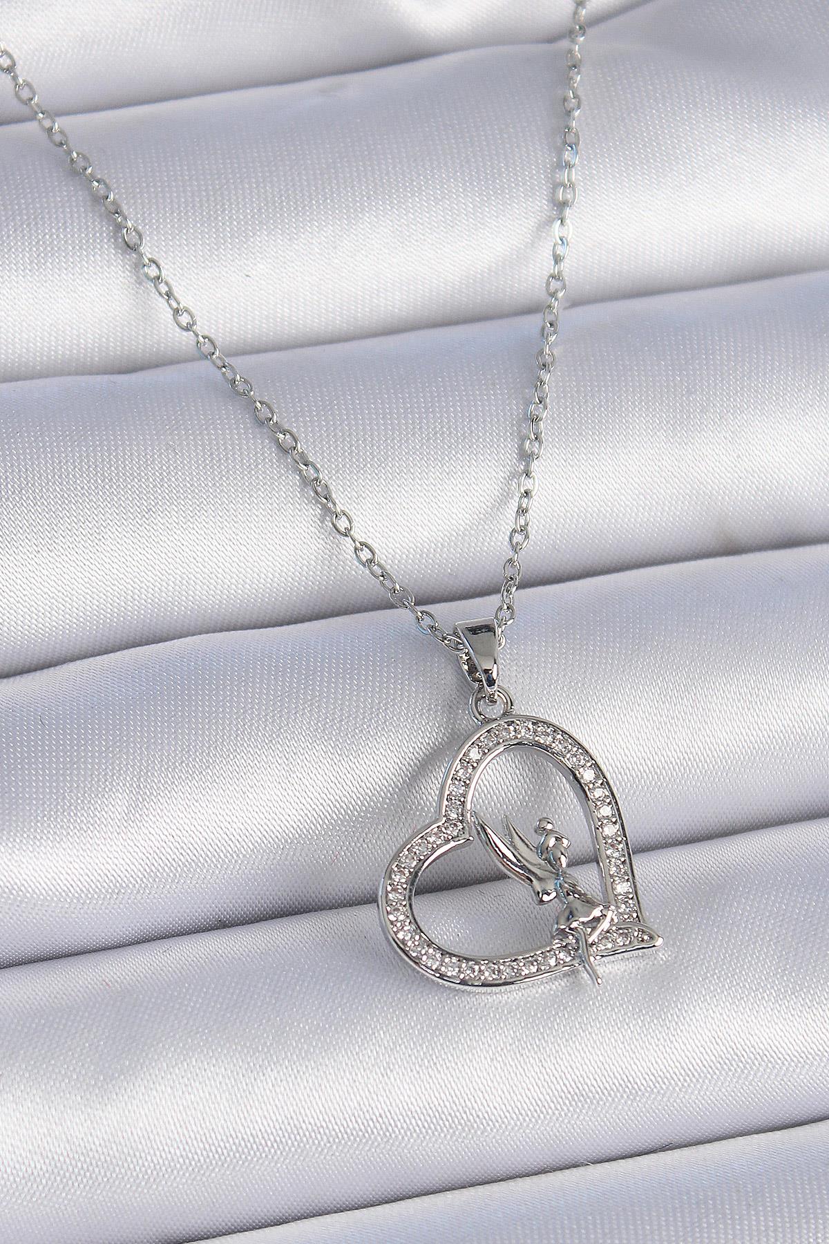 316L Çelik Zincir Gümüş Renk Zirkon Taşlı Kalp Model Melek Detay Kadın Kolye