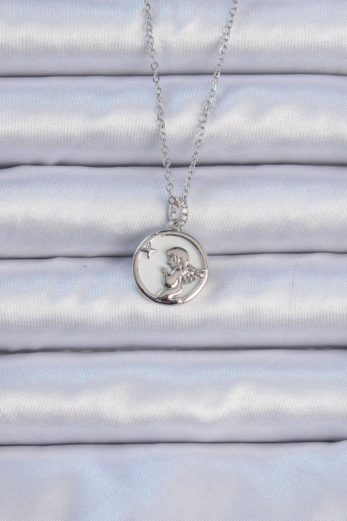316L Çelik Zincir Gümüş Renk Zirkon Taşlı Mineli Melek Kolye