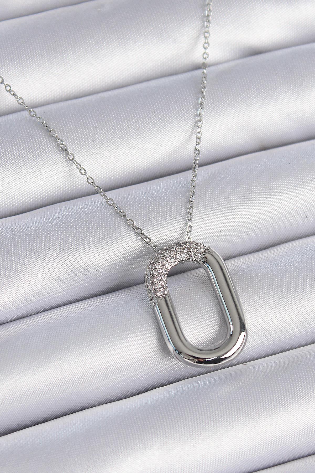316L Çelik Zincir Gümüş Renk Zirkon Taşlı Oval Halka Model Kadın Kolye