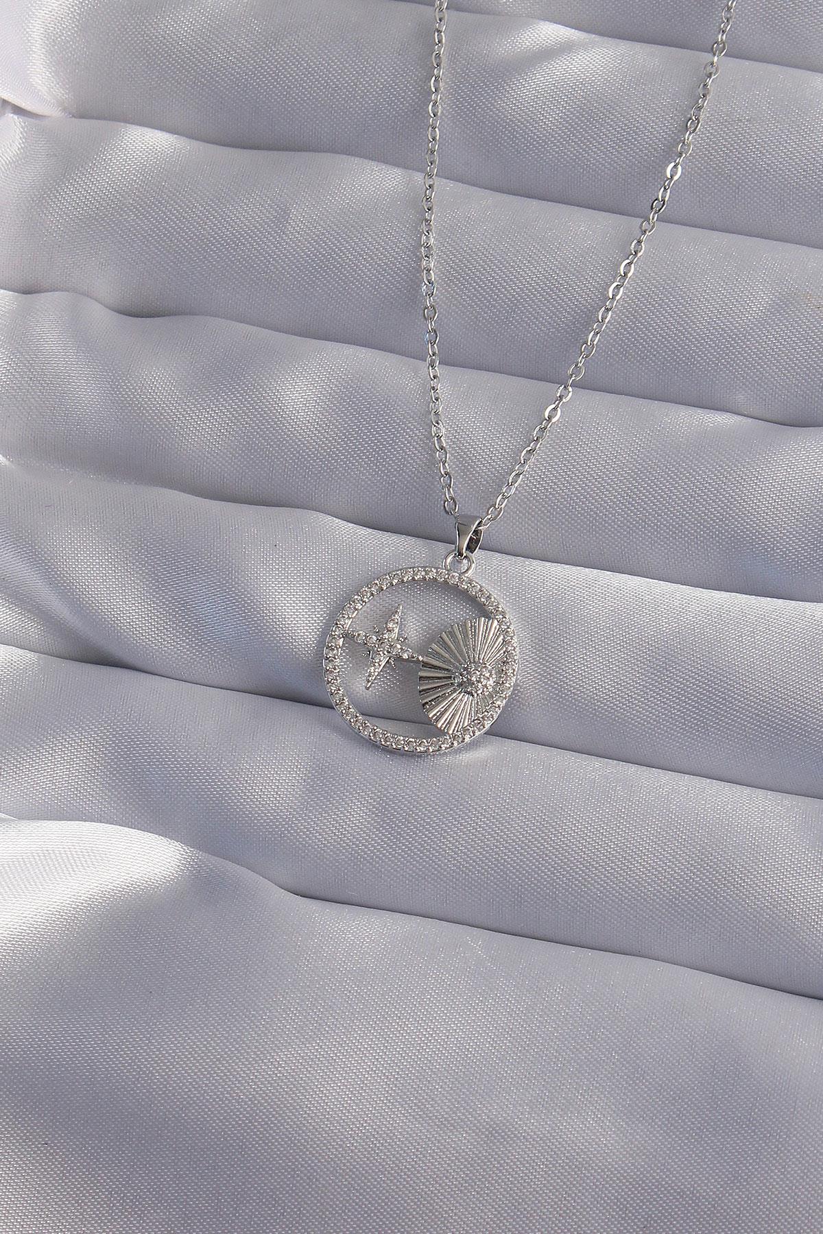 316L Çelik Zincir Gümüş Renk Zirkon Taşlı Yıldız Figürlü Oval Kolye