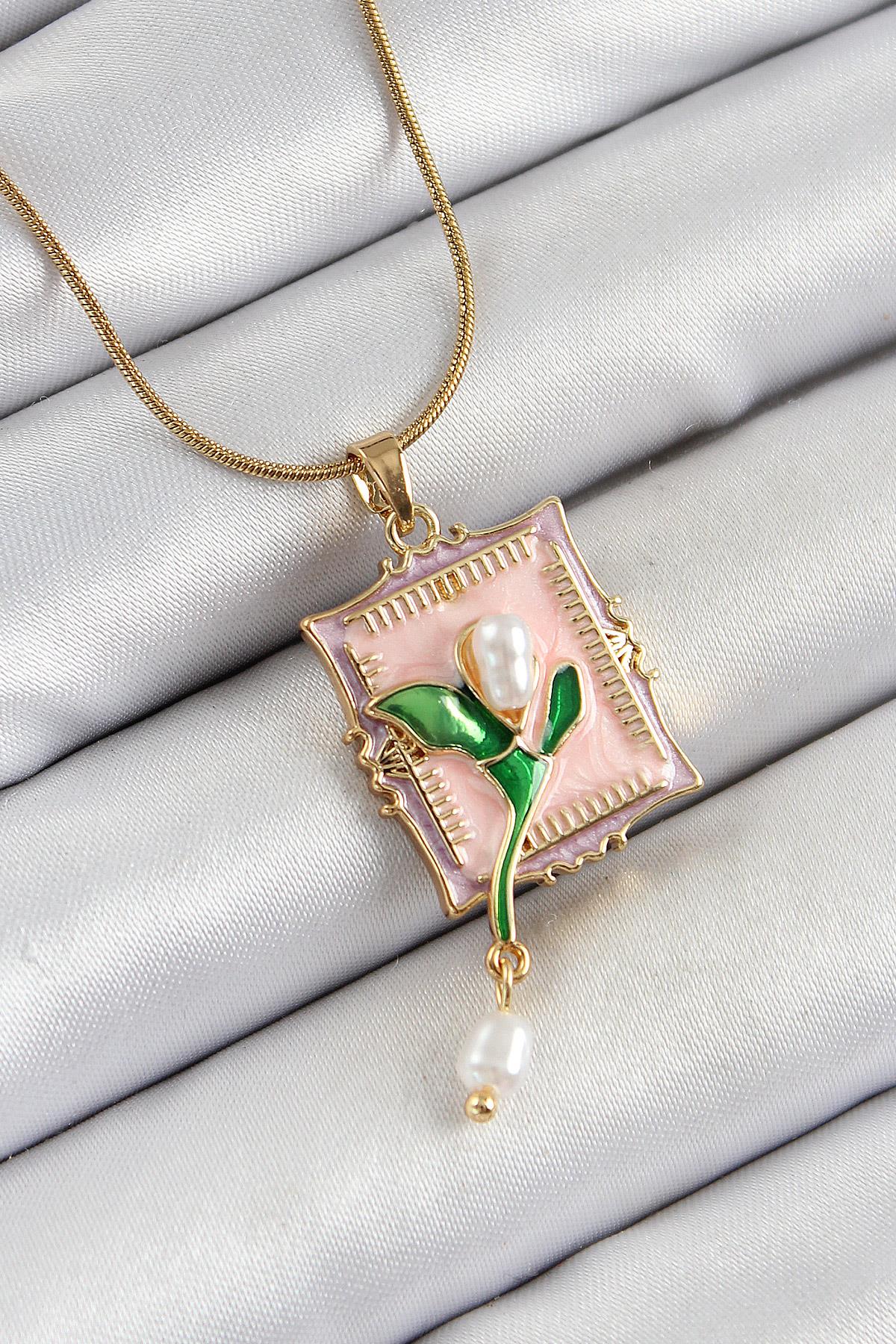 316L Çelik Zincir Pembe Sanatsal Portre Sallantılı İnci Detaylı Lale Model Gold Renk Kadın Kolye