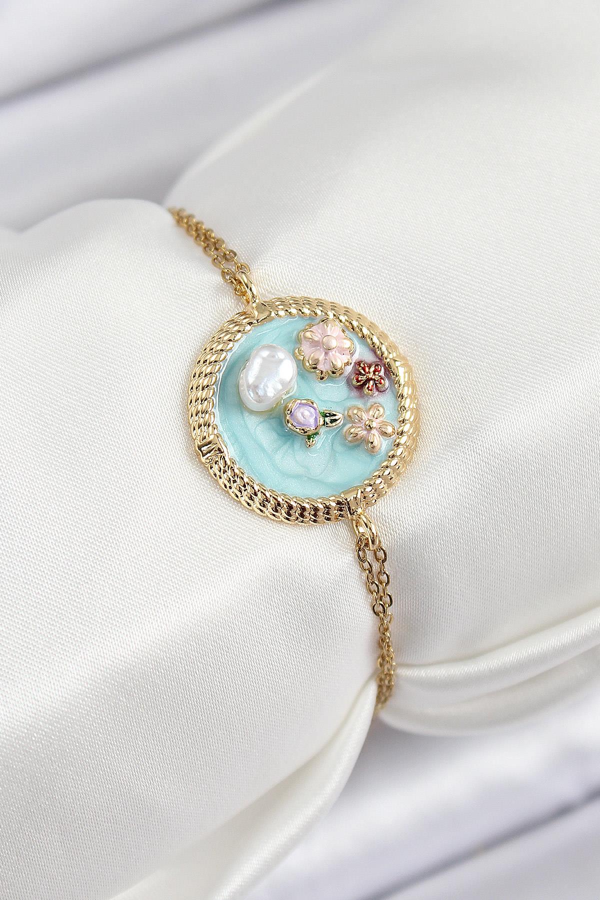 316L Çelik Zincir Turkuaz Mineli Sanatsal Portre İnci Detaylı Çiçek Model Gold Renk Kadın Bileklik