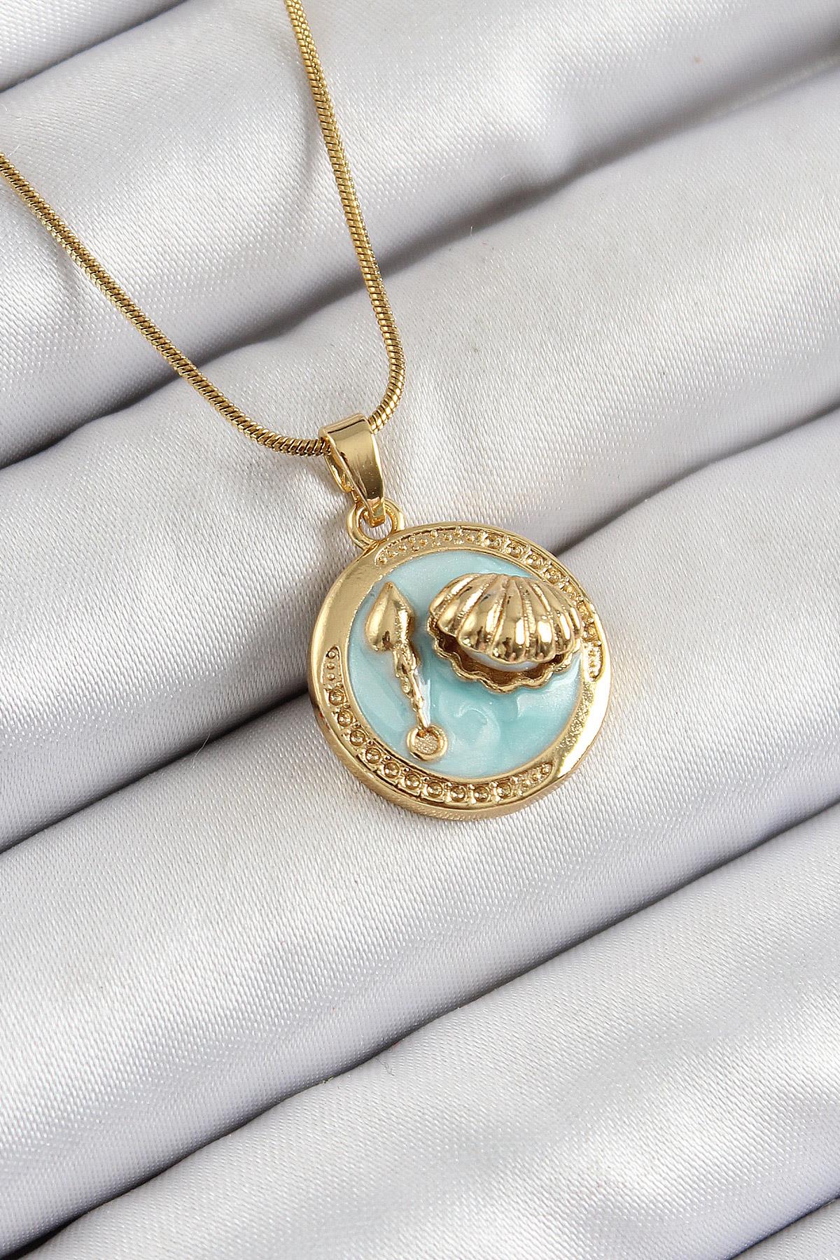 316L Çelik Zincir Turkuaz Mineli Sanatsal Portre İstiridye Model Gold Renk Kadın Kolye