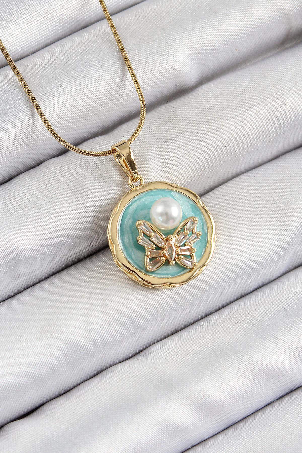 316L Çelik Zincir Zirkon Taşlı Turkuaz Sanatsal Portre İnci Detaylı Kelebek Model Gold Renk Kadın Kolye