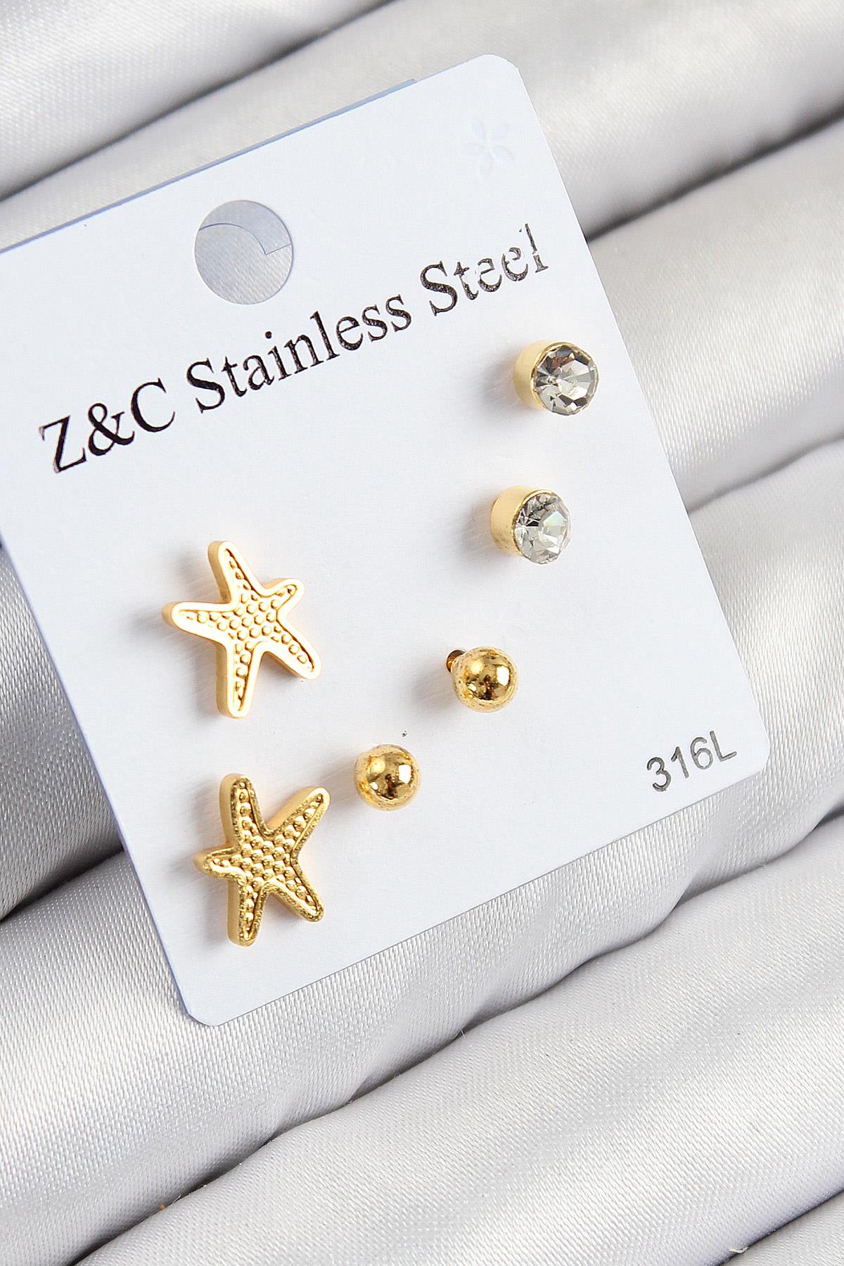 316L Çelik Zirkon Taşlı Deniz Yıldızı Model Gümüş Renk Kadın Set Küpe