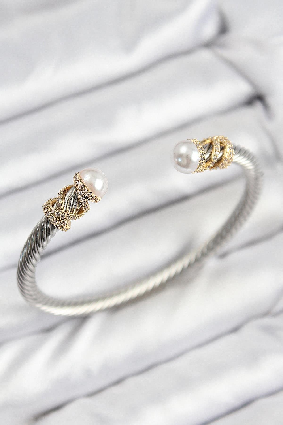 316L Çelik Zirkon Taşlı İnci Model Gold Ve Gümüş Renk Kadın Bileklik