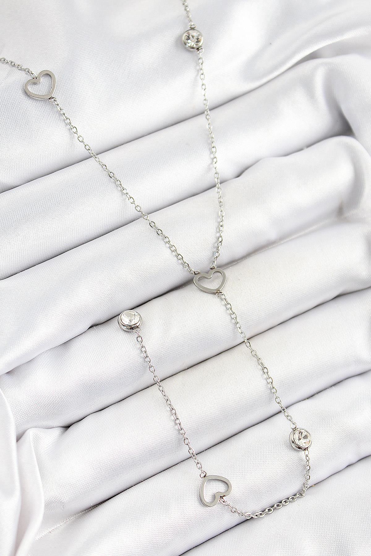 316L Çelik Zirkon Taşlı Kalp Figürlü Y Model Gümüş Renk Kadın Kolye