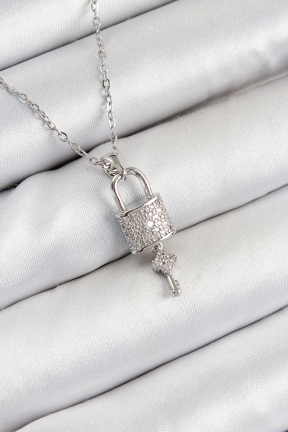 316L Çelik Zirkon Taşlı Kilit Ve Sallantılı Anahtar Model Gümüş Renk Kadın Kolye