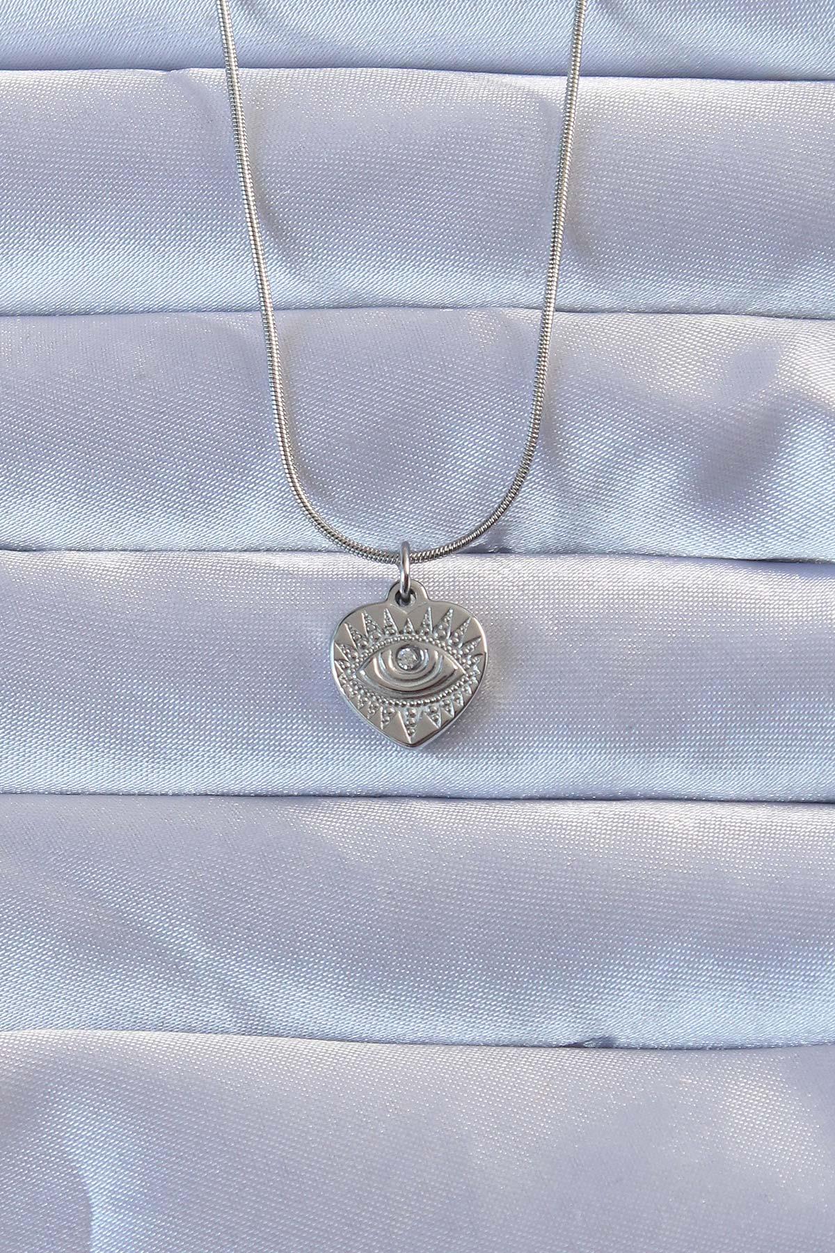 316L Gümüş Renk Zirkon Taşlı İşlemeli Göz Detay Kalp Kolye