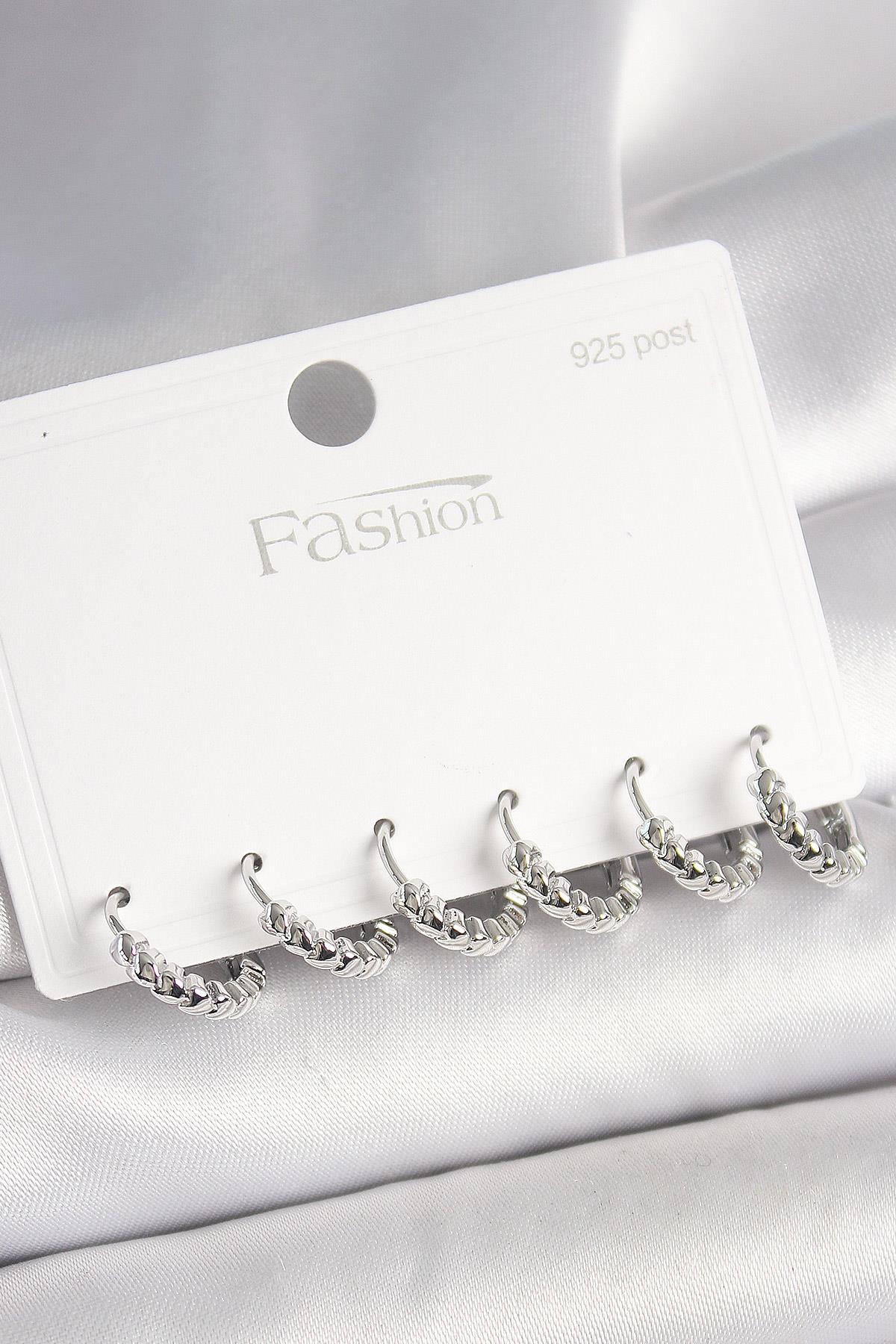 925 Ayar Gümüş Çivi Pirinç Gümüş Renk Kalp İşlemeli Halka Model Kadın Küpe Seti