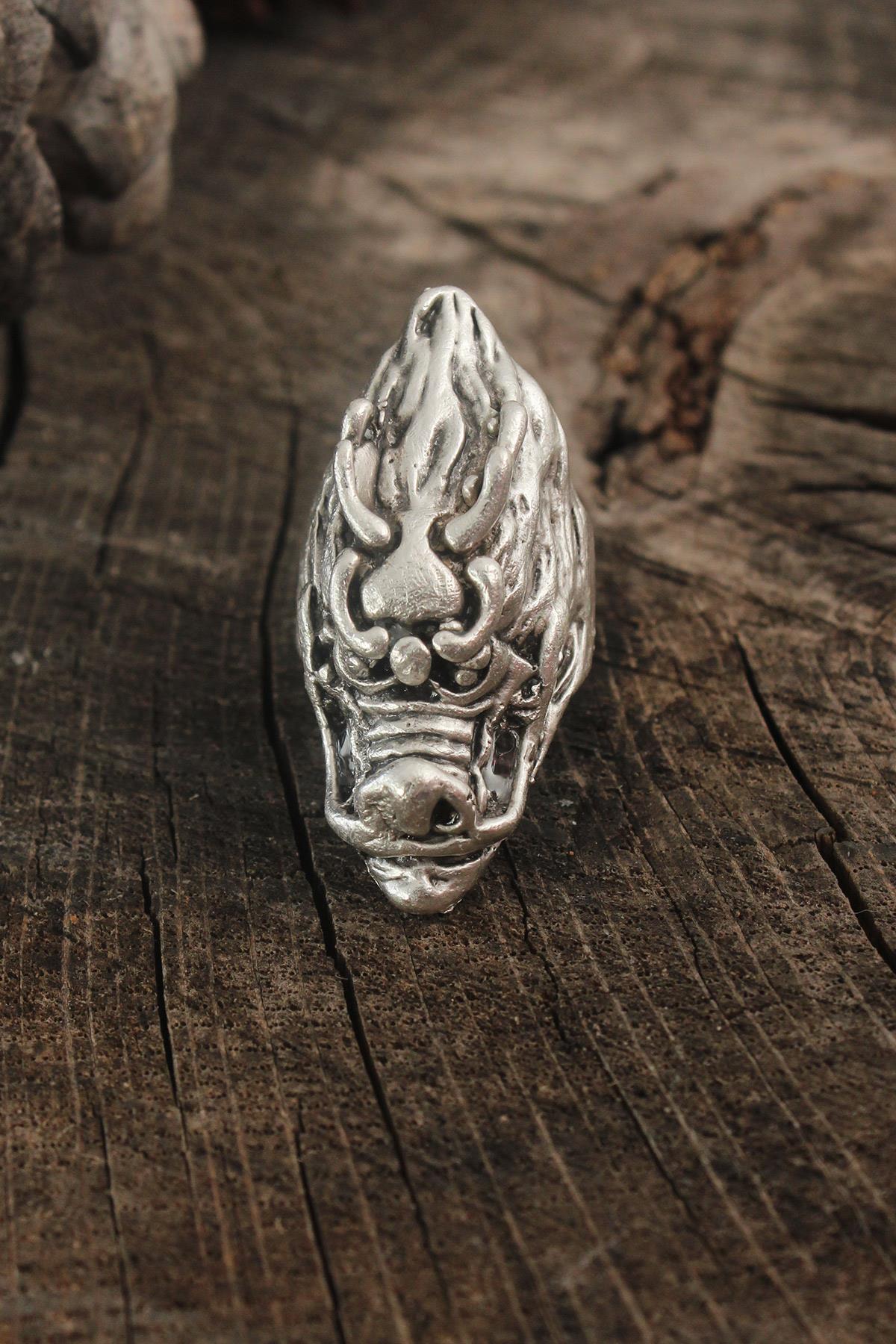 Antik Gümüş Renk Ejderha Kafası Model Ayarlanabilir Erkek Yüzük