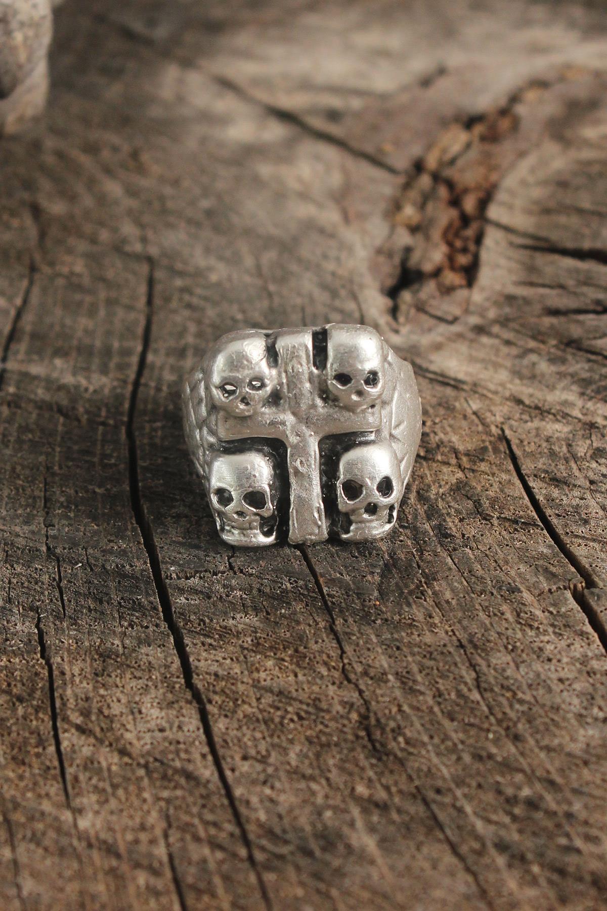Antik Gümüş Renk Haç Kuru Kafa İşleme Ayarlanabilir Erkek Yüzük