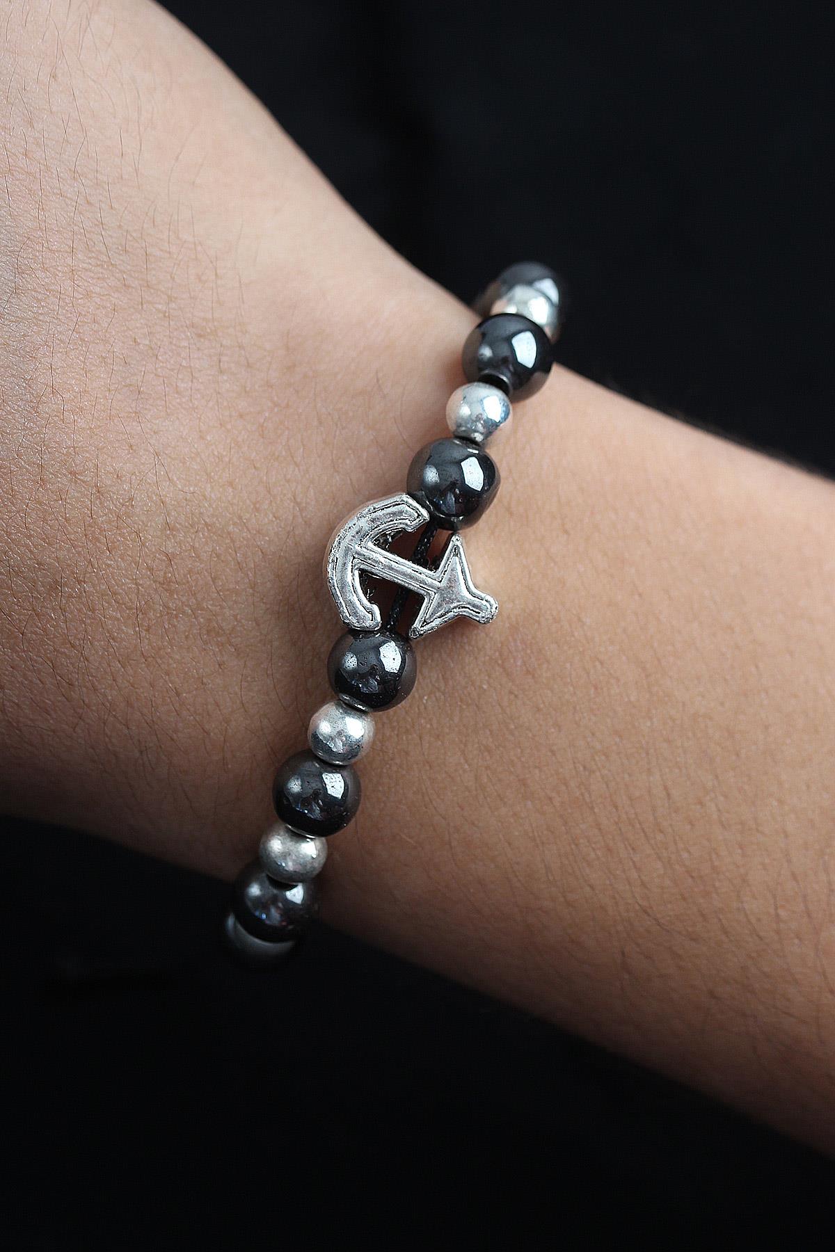 Doğal Taş Çapa Model Gümüş Ve Füme Renk Asansörlü Erkek Bileklik