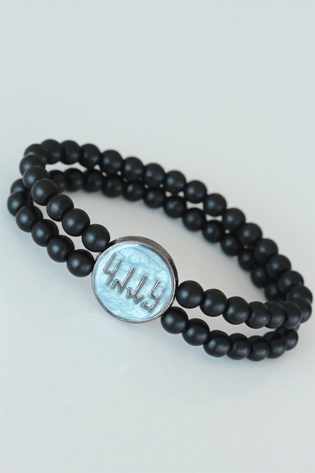 Eski Türkçe Göktürkçe Yazı Figürlü Açık Mavi Renk Metal Aksesuarlı Çift Sıra Oniks Doğal Taş Erkek Bileklik