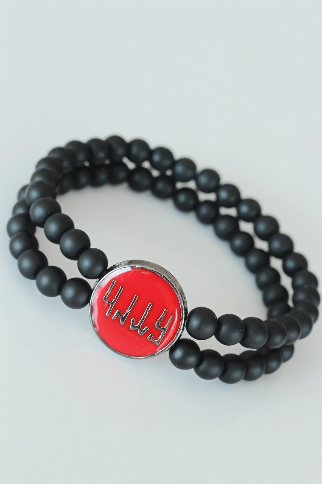 Eski Türkçe Göktürkçe Yazı Figürlü Kırmızı Metal Aksesuarlı Çift Sıra Oniks Doğal Taş Erkek Bileklik