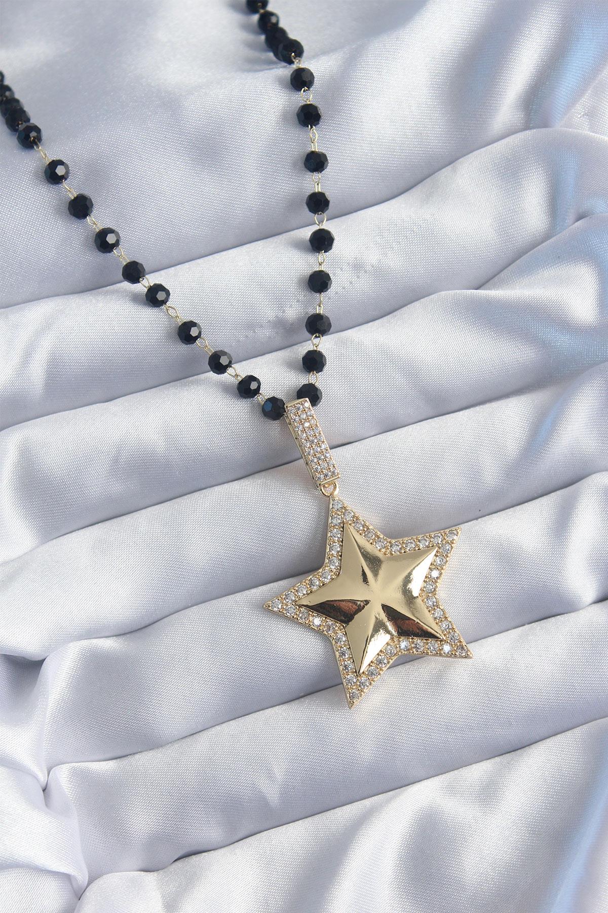 Gold Renk Siyah Boncuk Zirkon Taşlı Yıldız Model VİP Seri Kadın Kolye