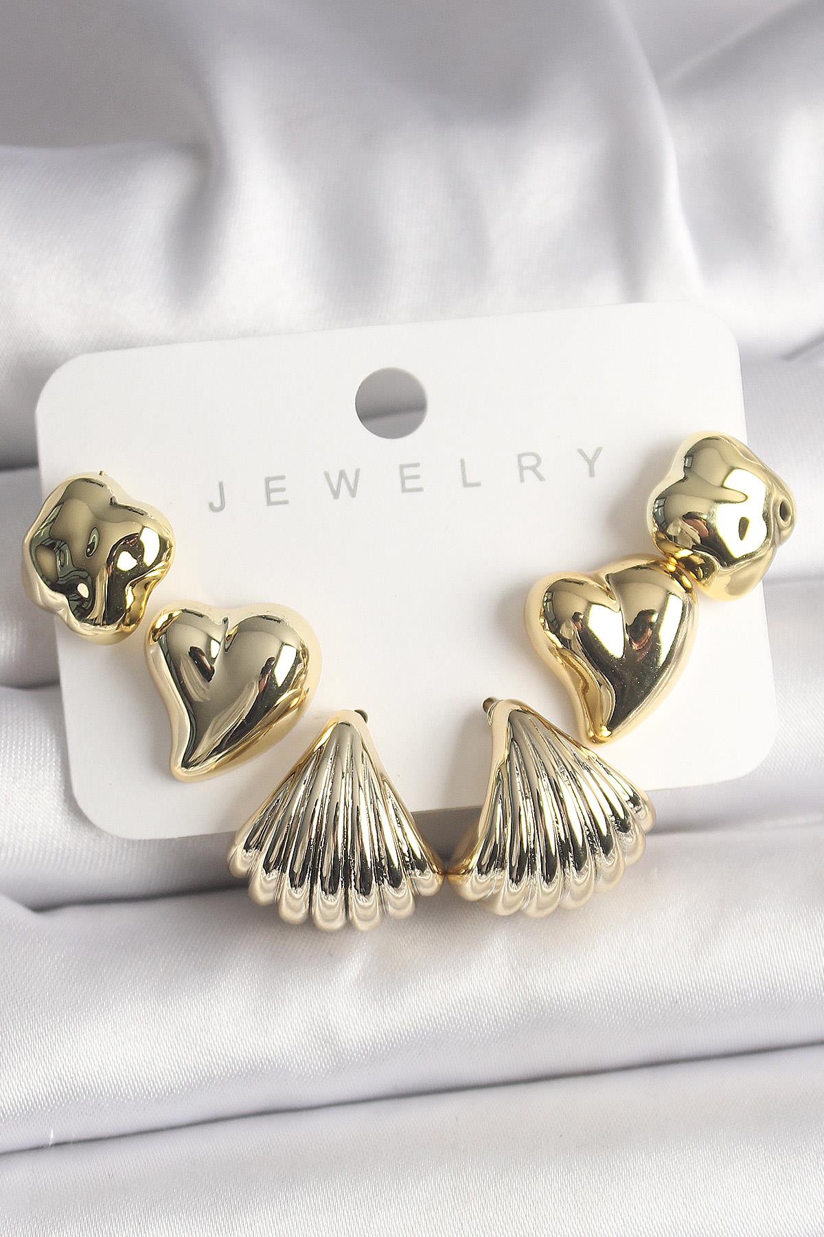 Gold Renk Yonca Kalp Deniz Kabuğu Figür CCB Kadın Küpe Seti