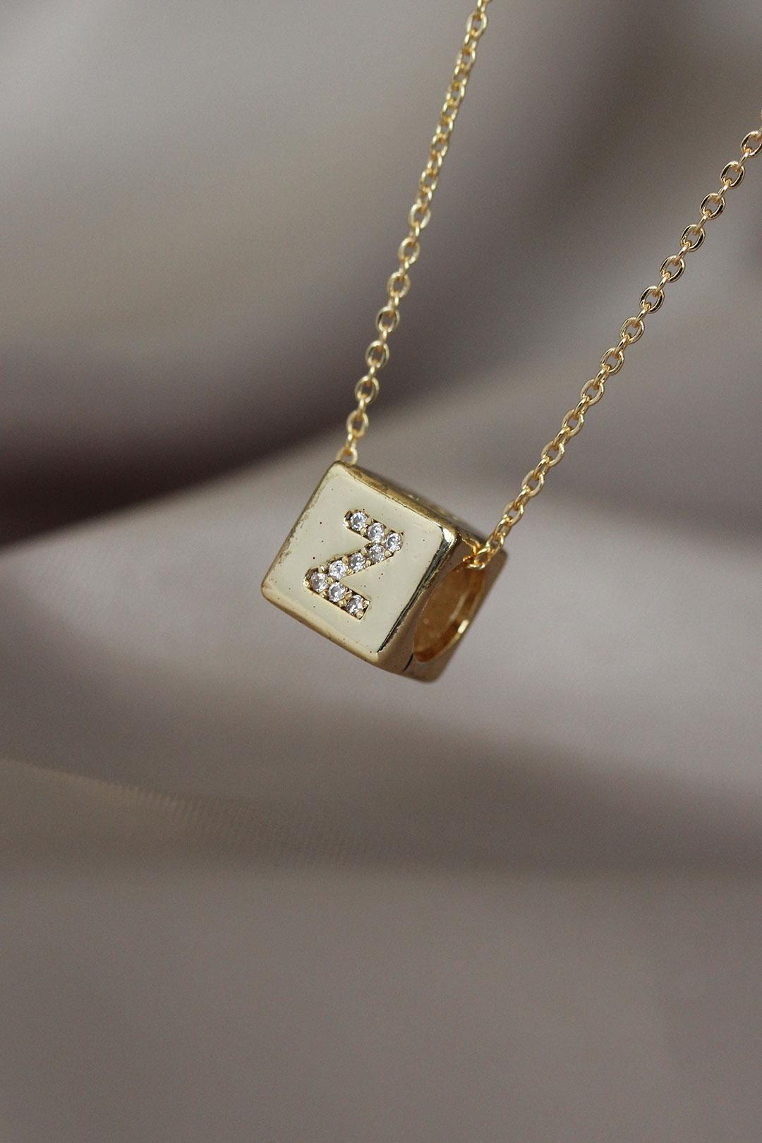 Gold Renkli Küp Model Zirkon Taşlı Z Harfli Kolye