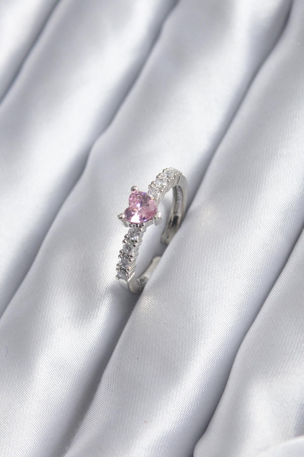 Gümüş Renk Zirkon Taşlı Pembe Kristal Kalp Model Kadın Yüzük