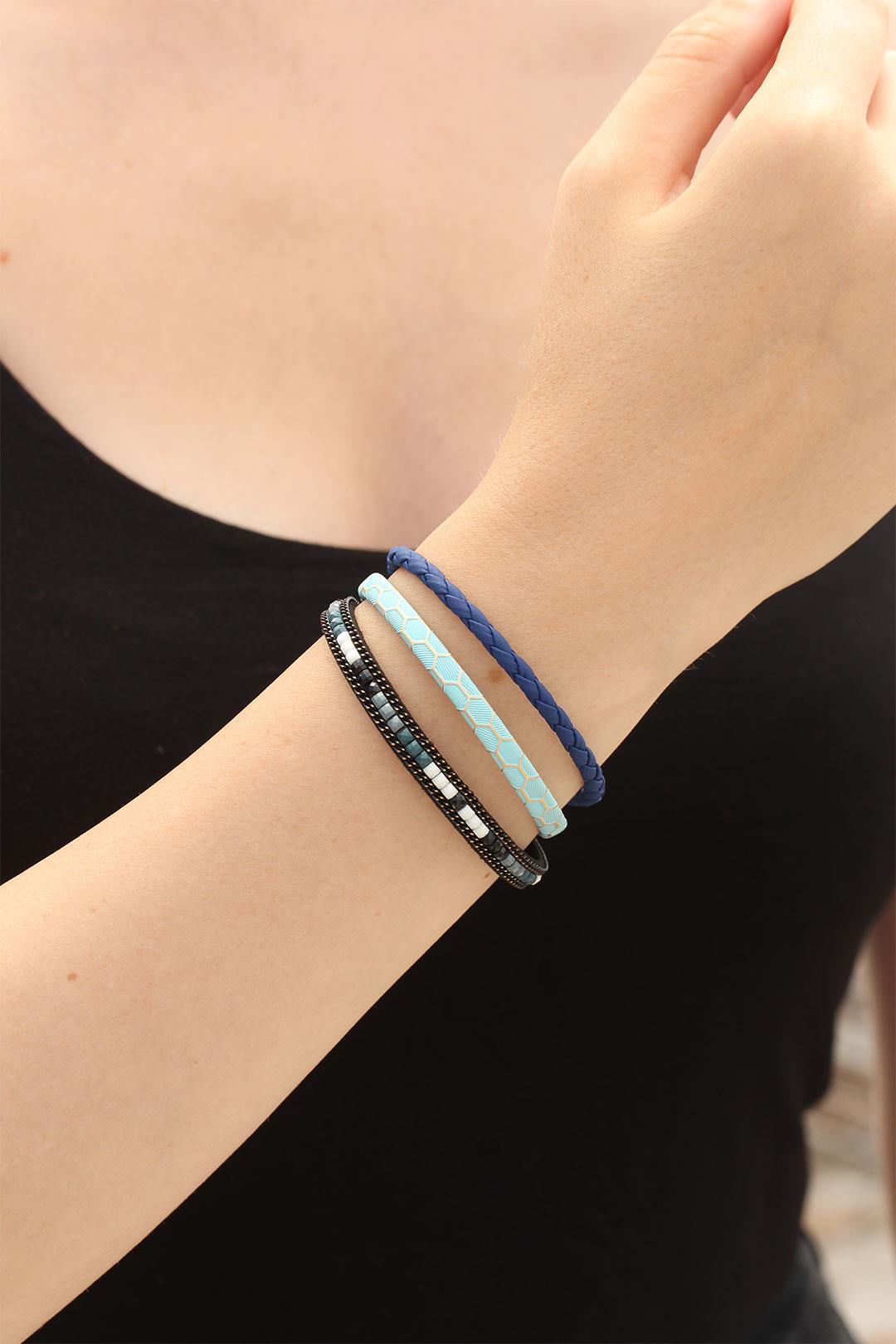 Mavi Renk Desenli Tasarımlı Taşlı Lacivert Örgü Model Kadın Deri Bileklik