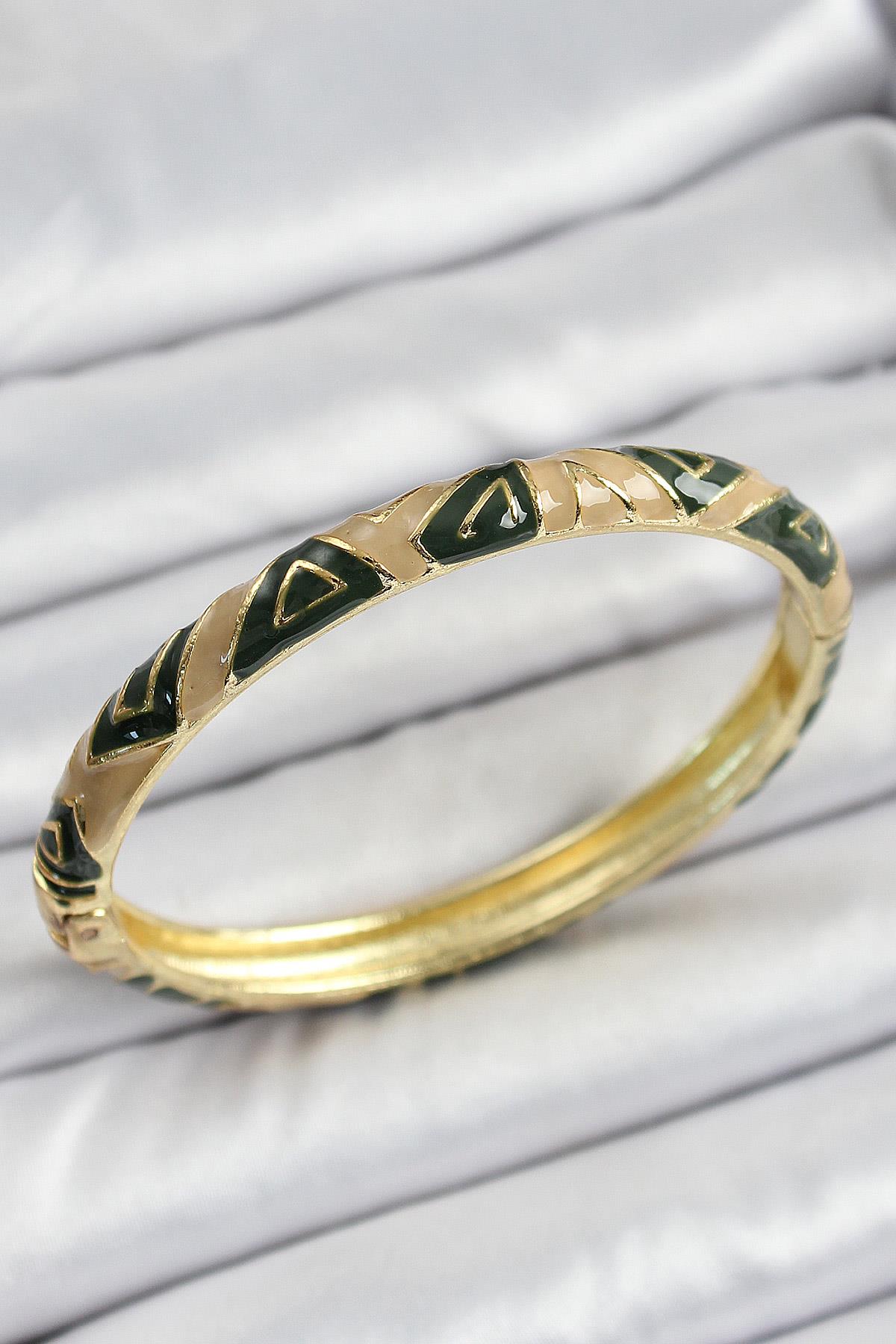 Mineli Pirinç Kahverengi Siyah Geometrik Desenli Kadın Kelepçe