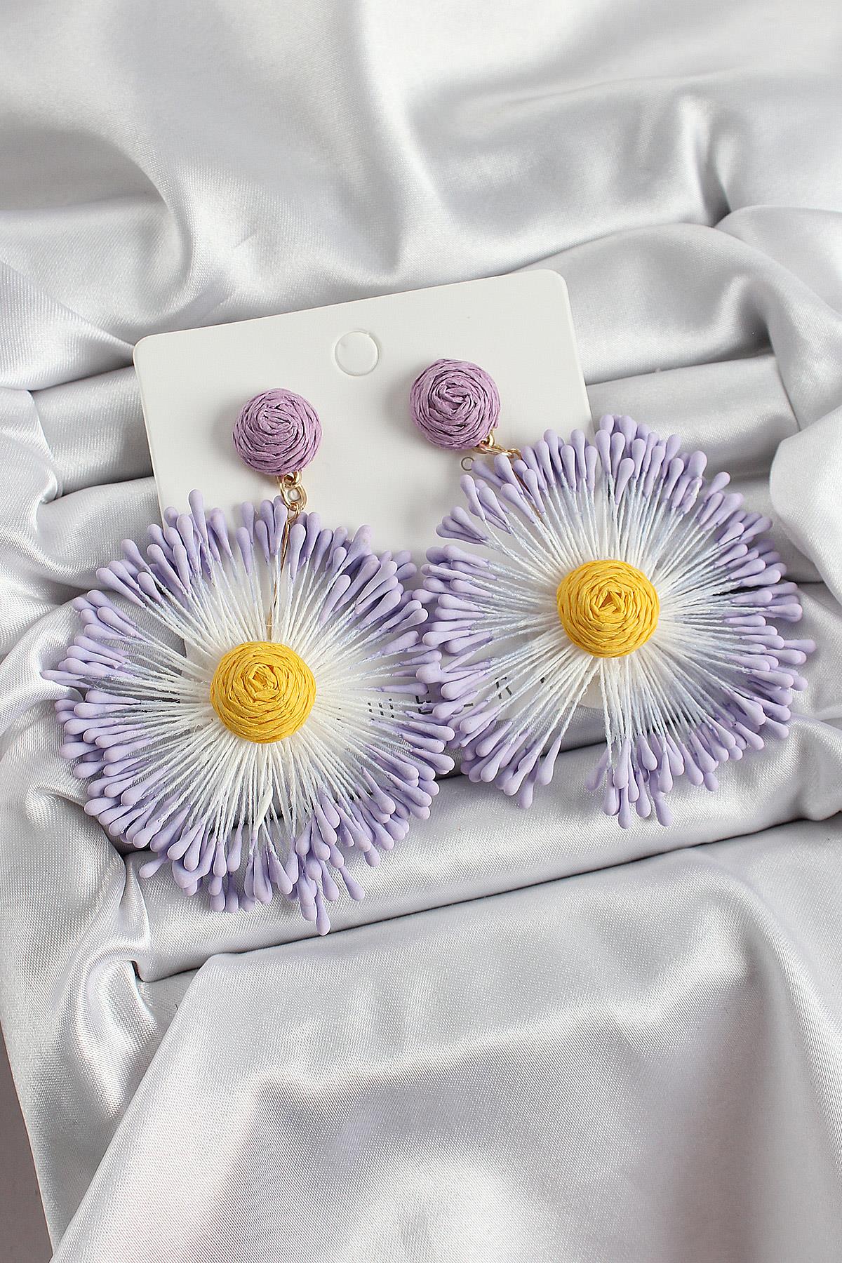 Mor Püsküllü Papatya Figürlü Hasır Örgü Model Gold Renk Kadın Küpe