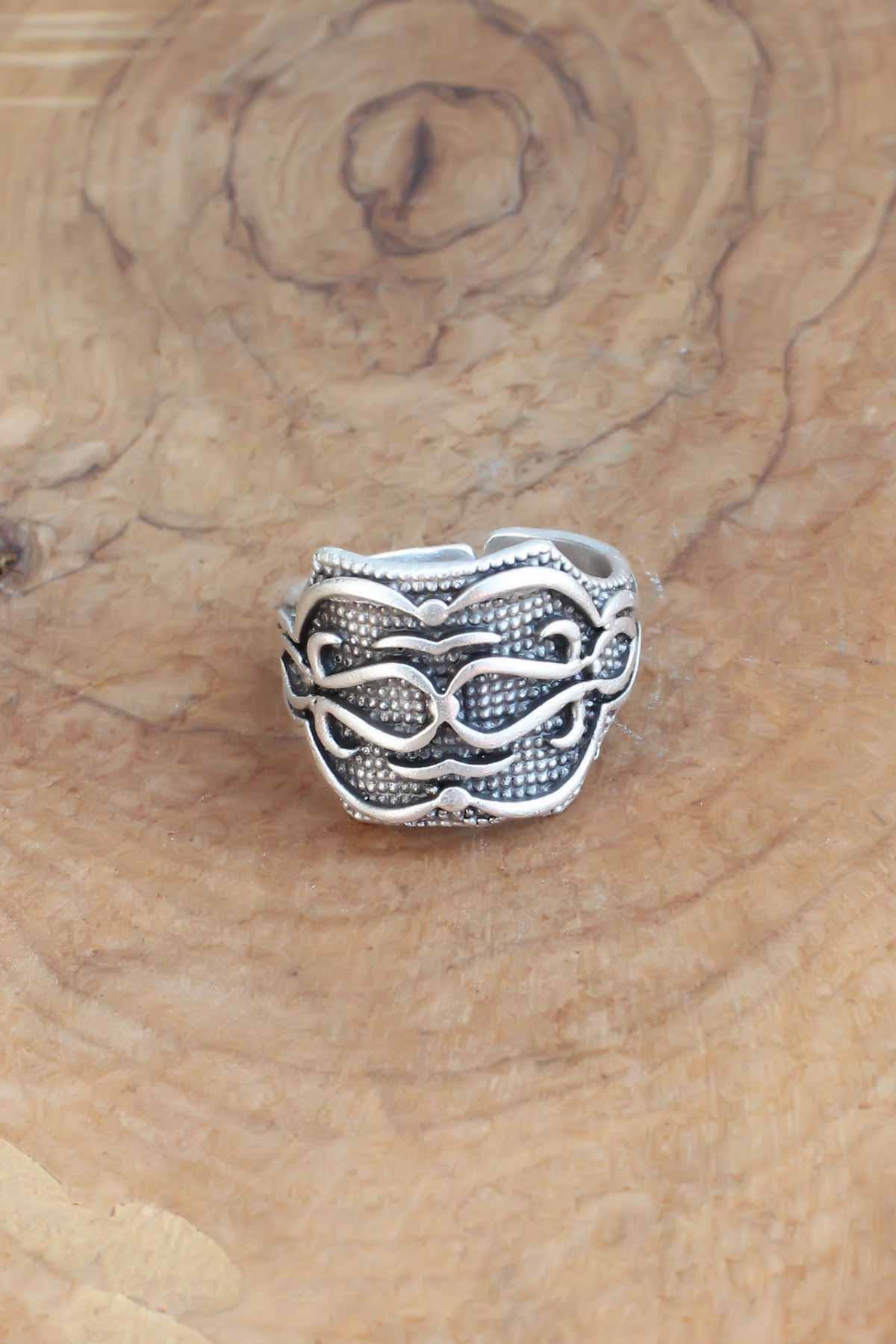 Motifli Gümüş Renk Ayarlanabilir Erkek Yüzük