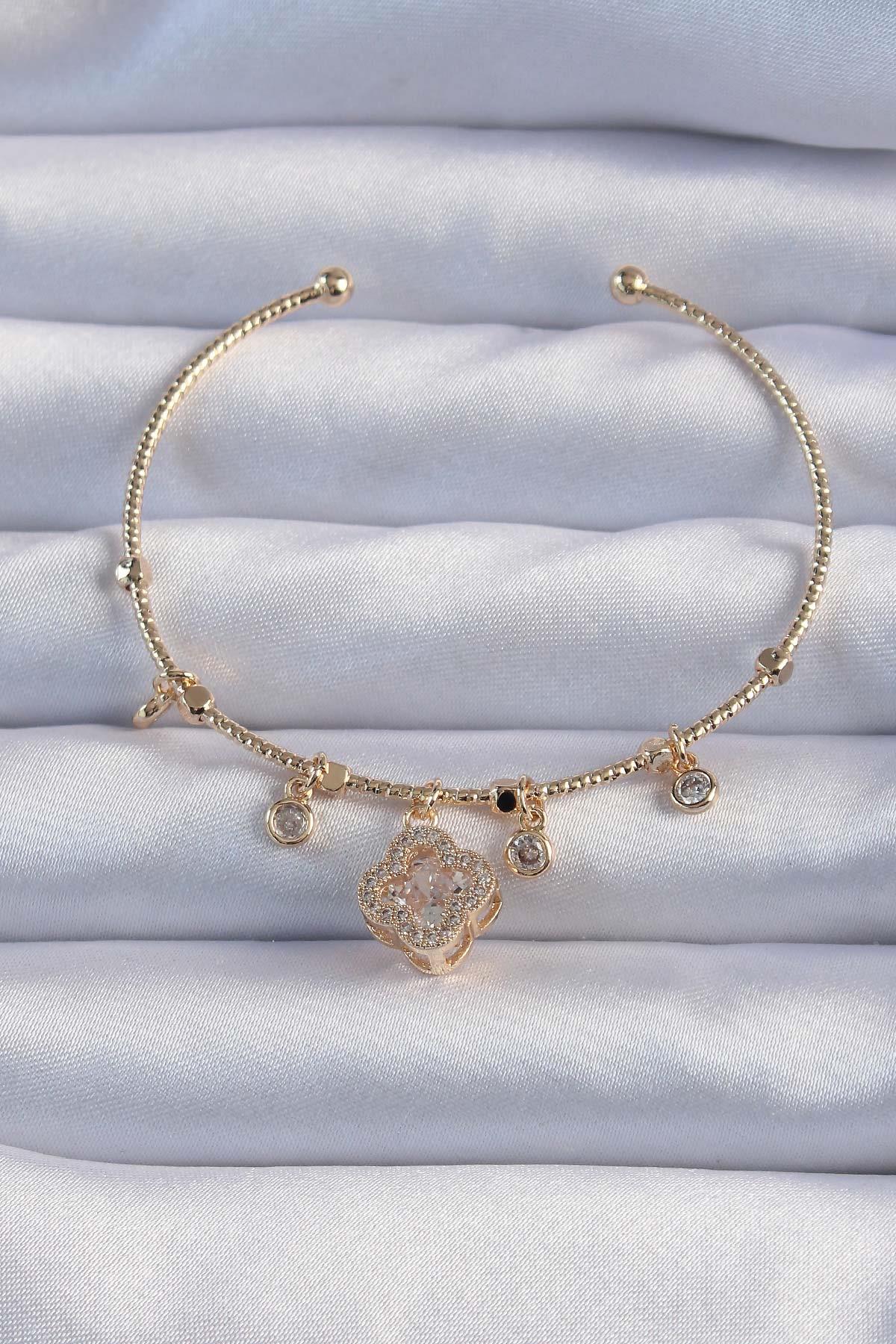 Pirinç Altın Renk Zirkon Taşlı Yonca Model Charm Bileklik