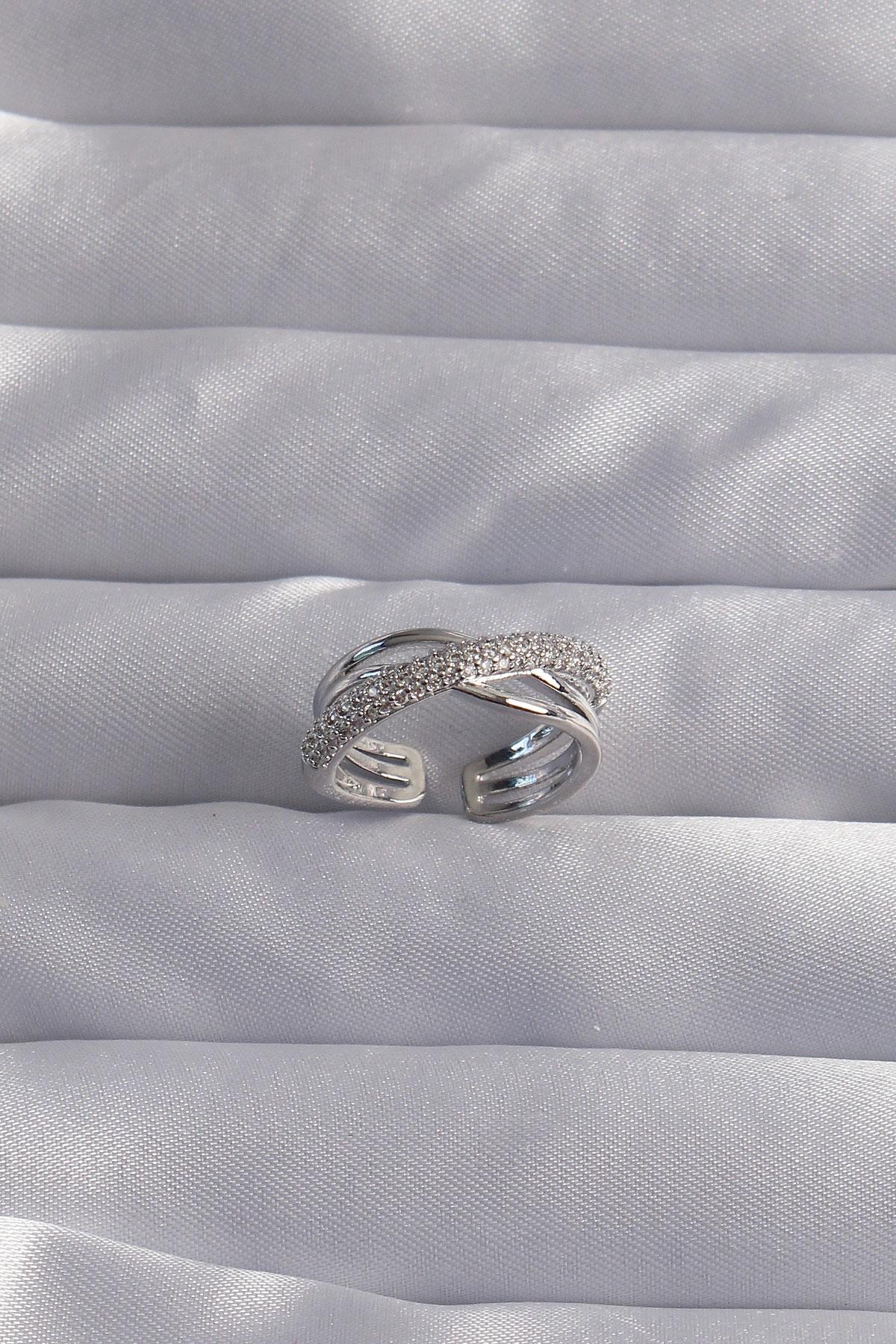 Pirinç Ayarlamalı Gümüş Renk Zirkon Taşlı Çapraz Görünüm Yüzük