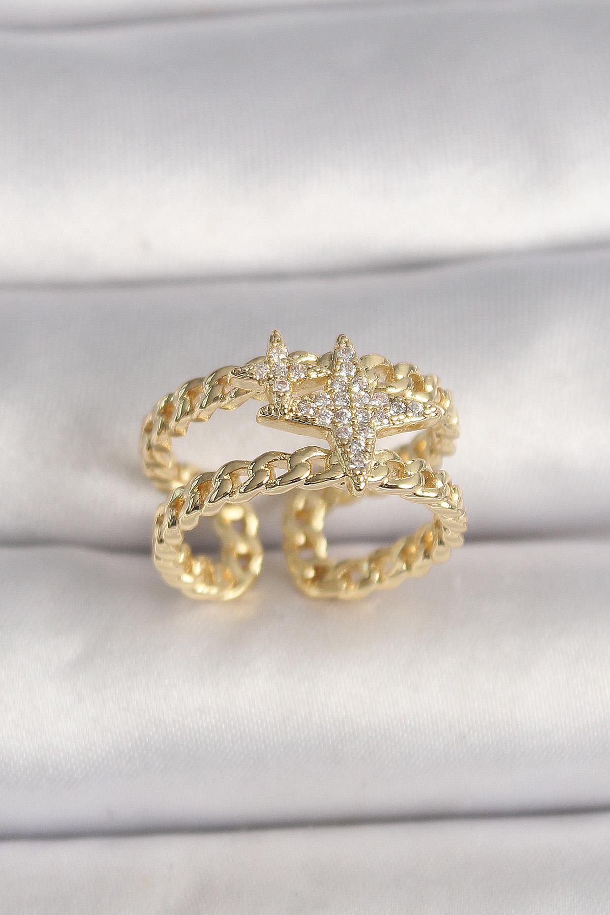 Pirinç Gold Renk 2'Li Zincir Zirkon Taşlı Yıldız Figür Kadın Yüzük