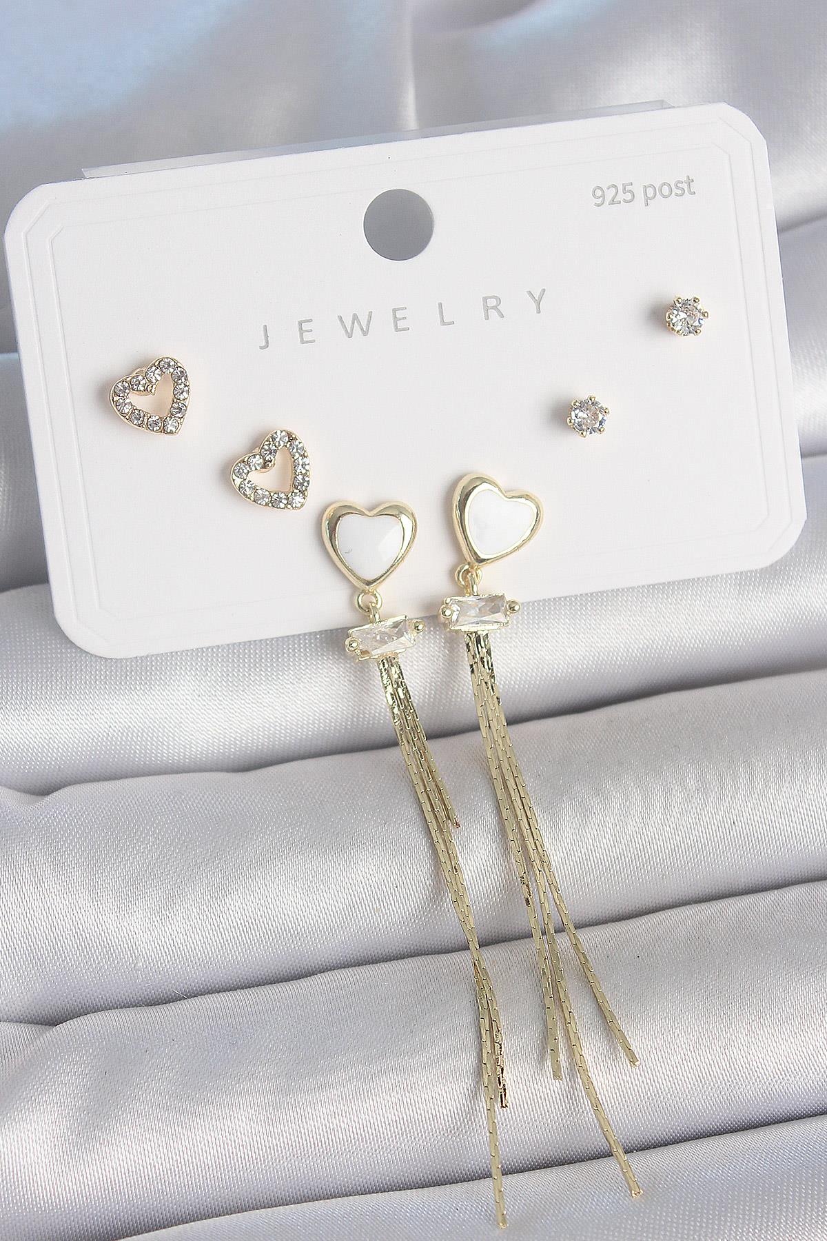 Pirinç Gold Renk Beyaz Mineli Sallantı Mineli Kalp Model Zirkon Taş Detaylı 925 Ayar Gümüş Çivi Kadın Küpe Seti