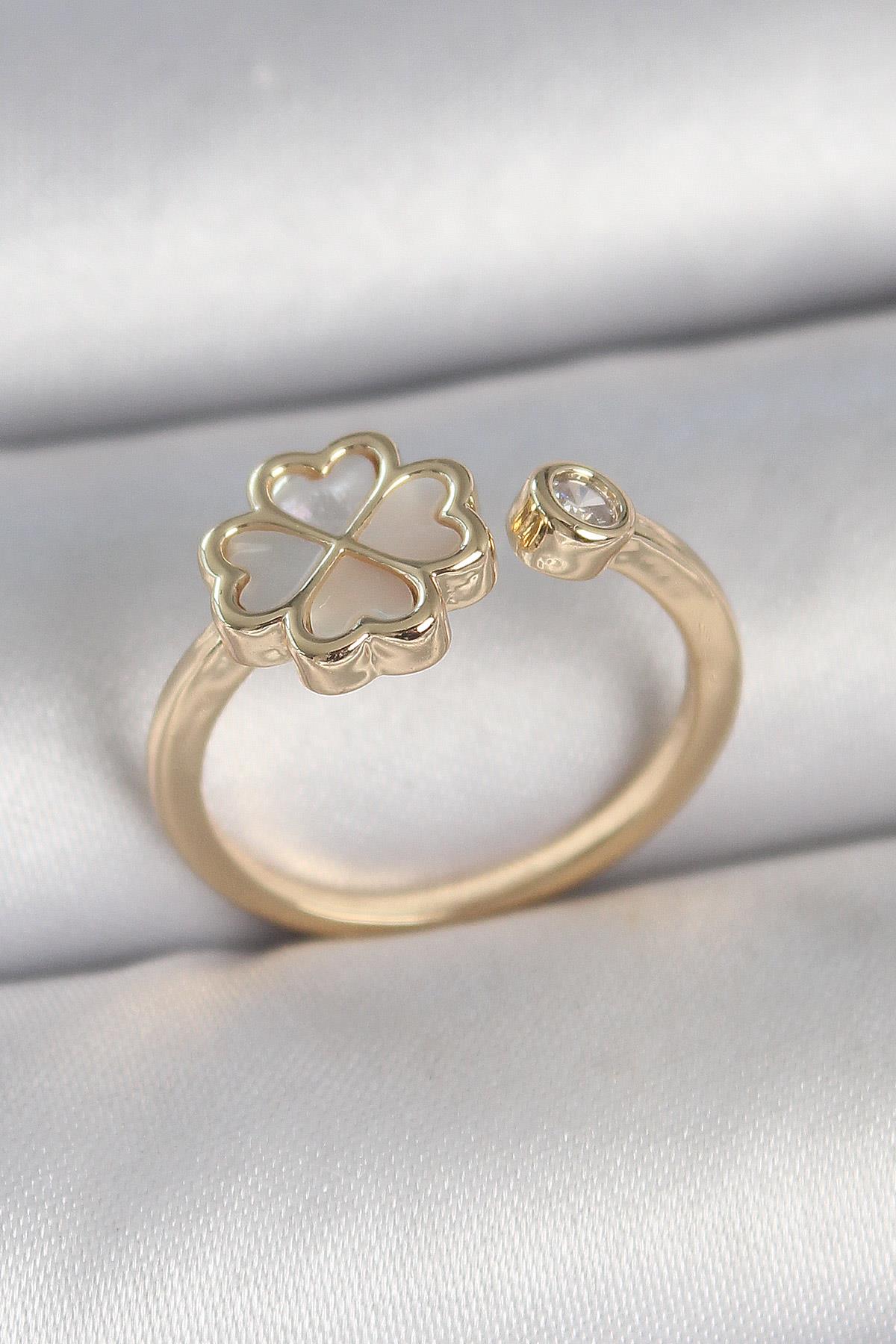 Pirinç Gold Renk Beyaz Mineli Yonca Model Zirkon Taş Detay Ayarlanabilir Kadın Yüzük