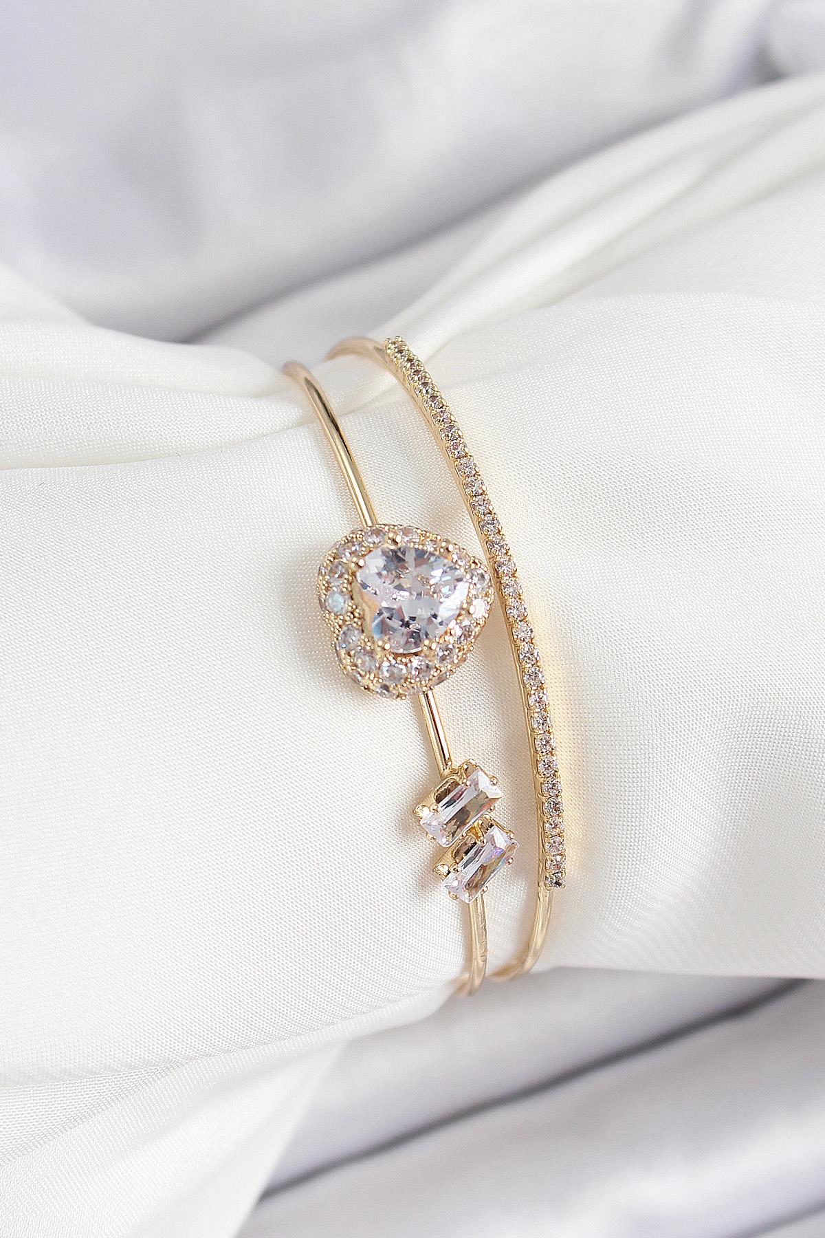 Pirinç Gold Renk Kalpli Zirkon Taşlı Kadın Bileklik