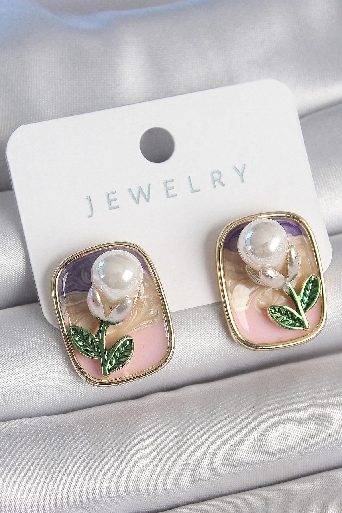 Pirinç Gold Renk Mix Renk Mineli İncili Çiçek Model Portre Model Kadın Küpe