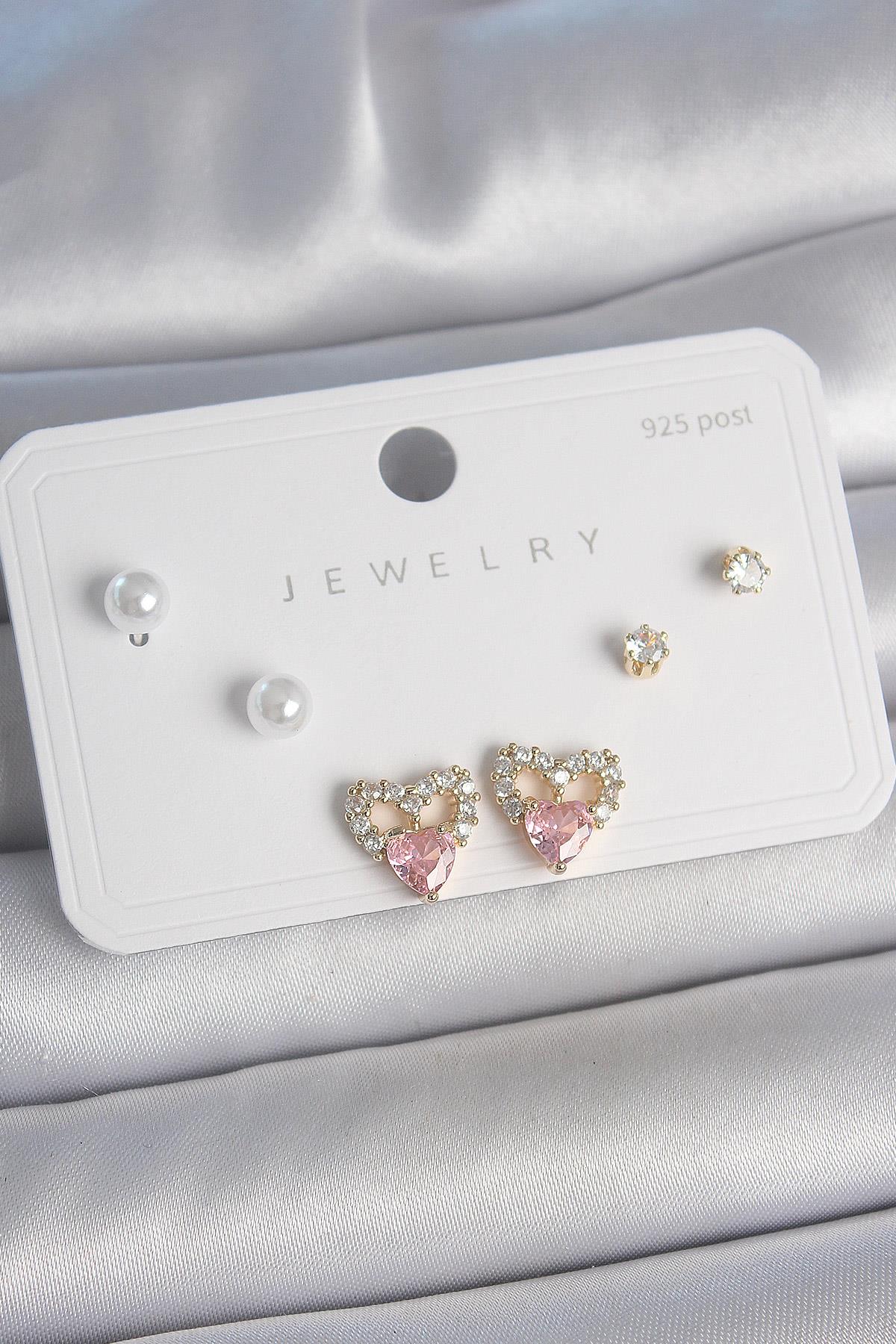 Pirinç Gold Renk Pembe Zirkon Taşlı Kalp Model İnci Detay 925 Ayar Kadın Küpe Seti
