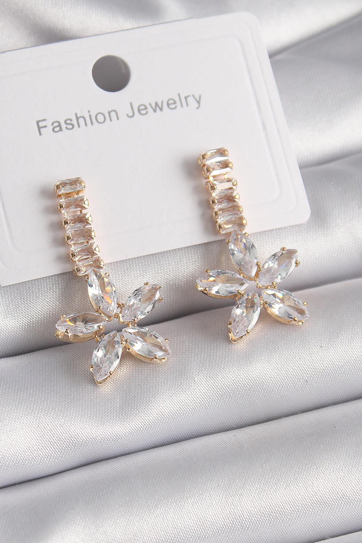 Pirinç Gold Renk Su Yolu Zirkon Taşlı Çiçek Model Kadın Küpe