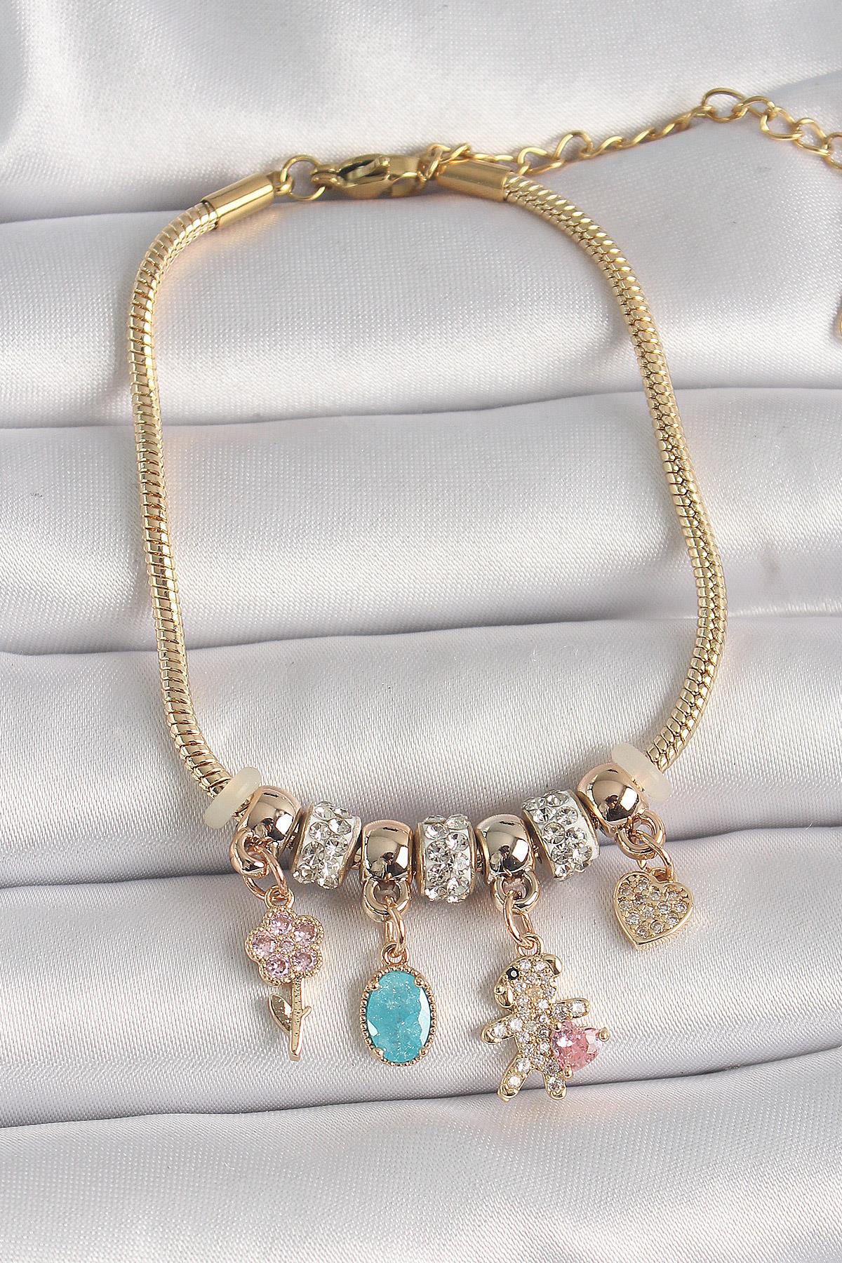 Pirinç Gold Renk Zincir Sallantı Zirkon Taşlı Ayıcık Figür Çiçek Detay Kadın Bileklik