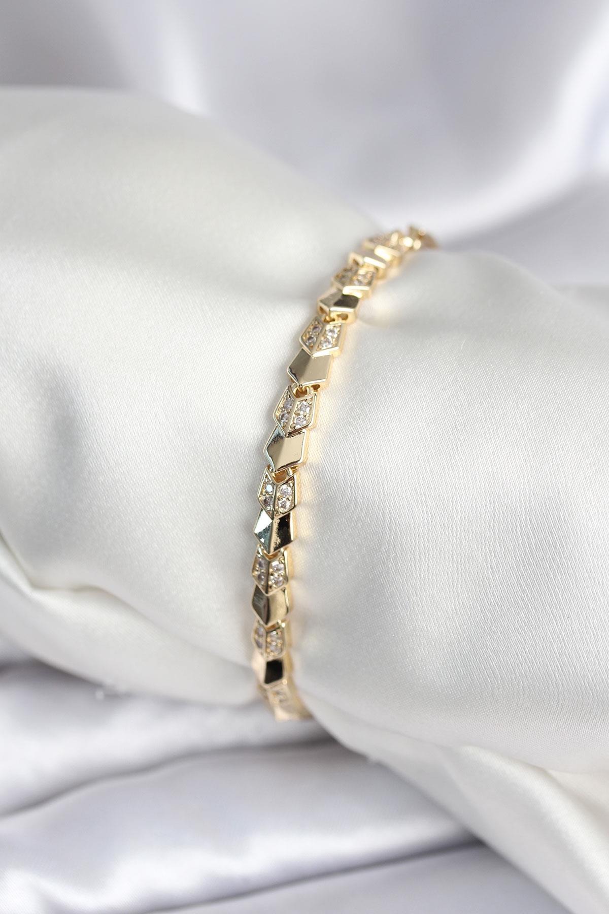 Pirinç Gold Renk Zirkon Taşlı Balık Sırtı Model Kadın Bileklik