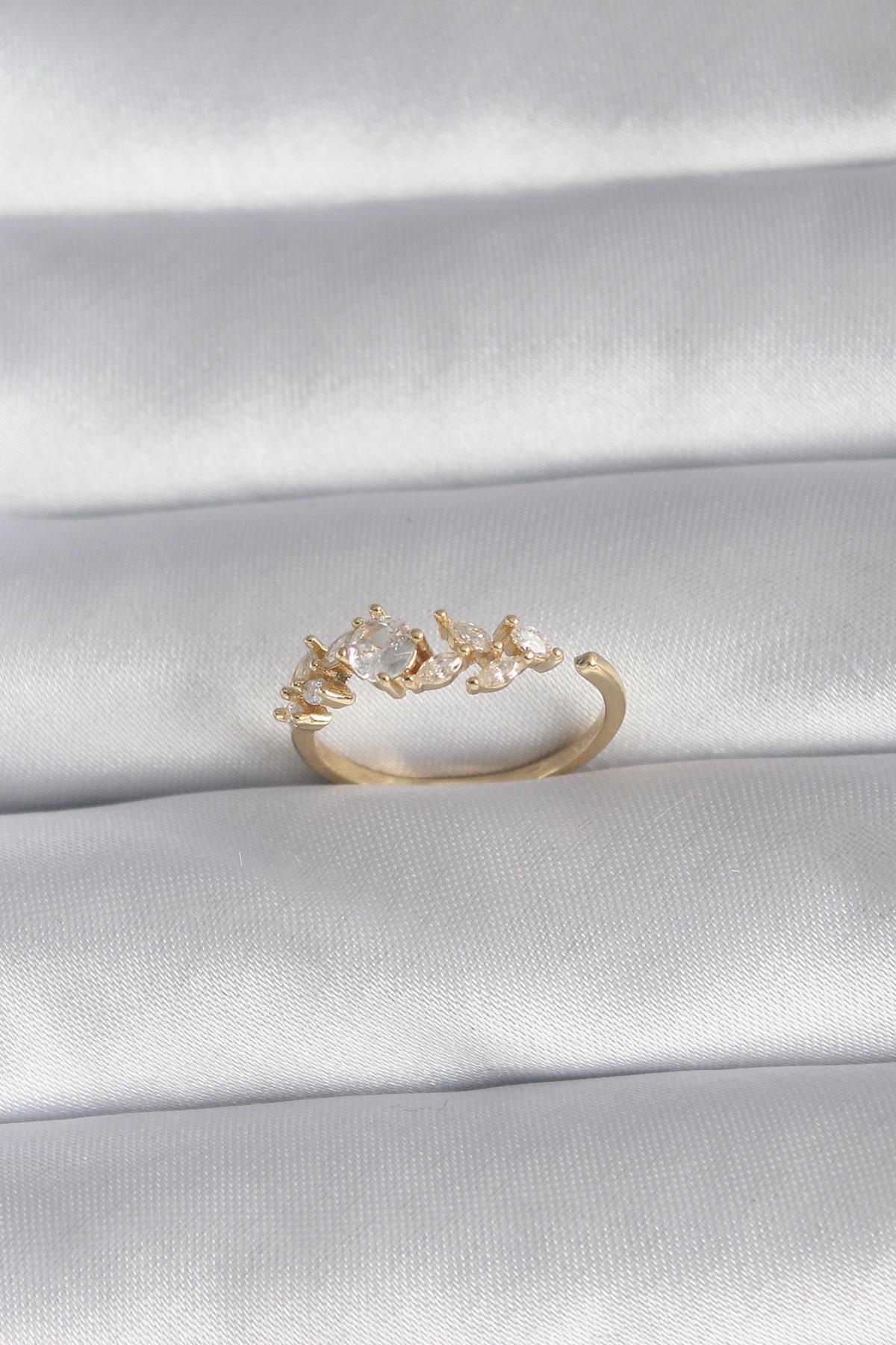 Pirinç Gold Renk Zirkon Taşlı Çiçek Model Kadın Yüzük