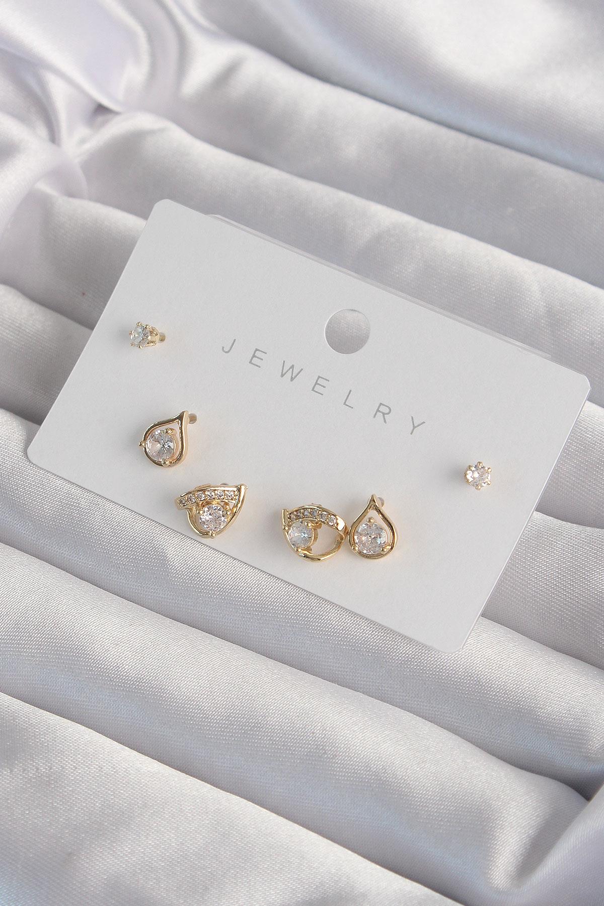 Pirinç Gold Renk Zirkon Taşlı Damla Model Küpe Seti