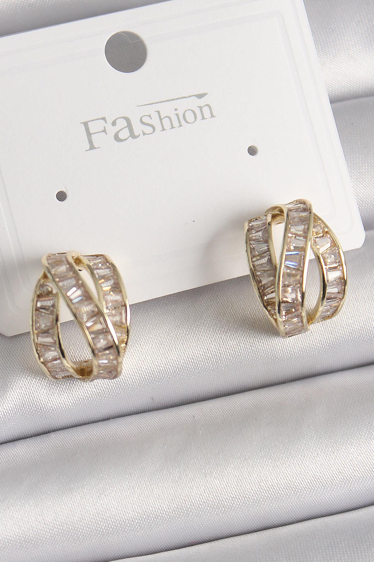 Pirinç Gold Renk Zirkon Taşlı Düğüm Halka Model Kadın Küpe