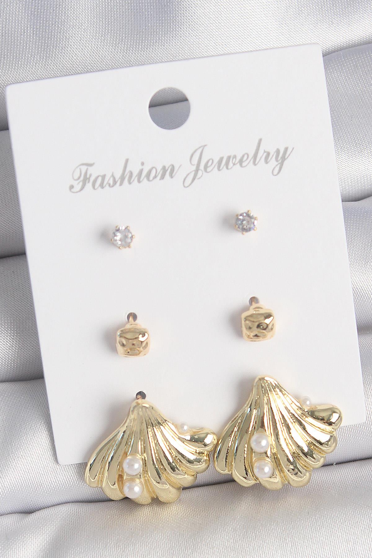 Pirinç Gold Renk Zirkon Taşlı İnci Detaylı Deniz Kabuğu Model 3 Çift Kadın Küpe Seti