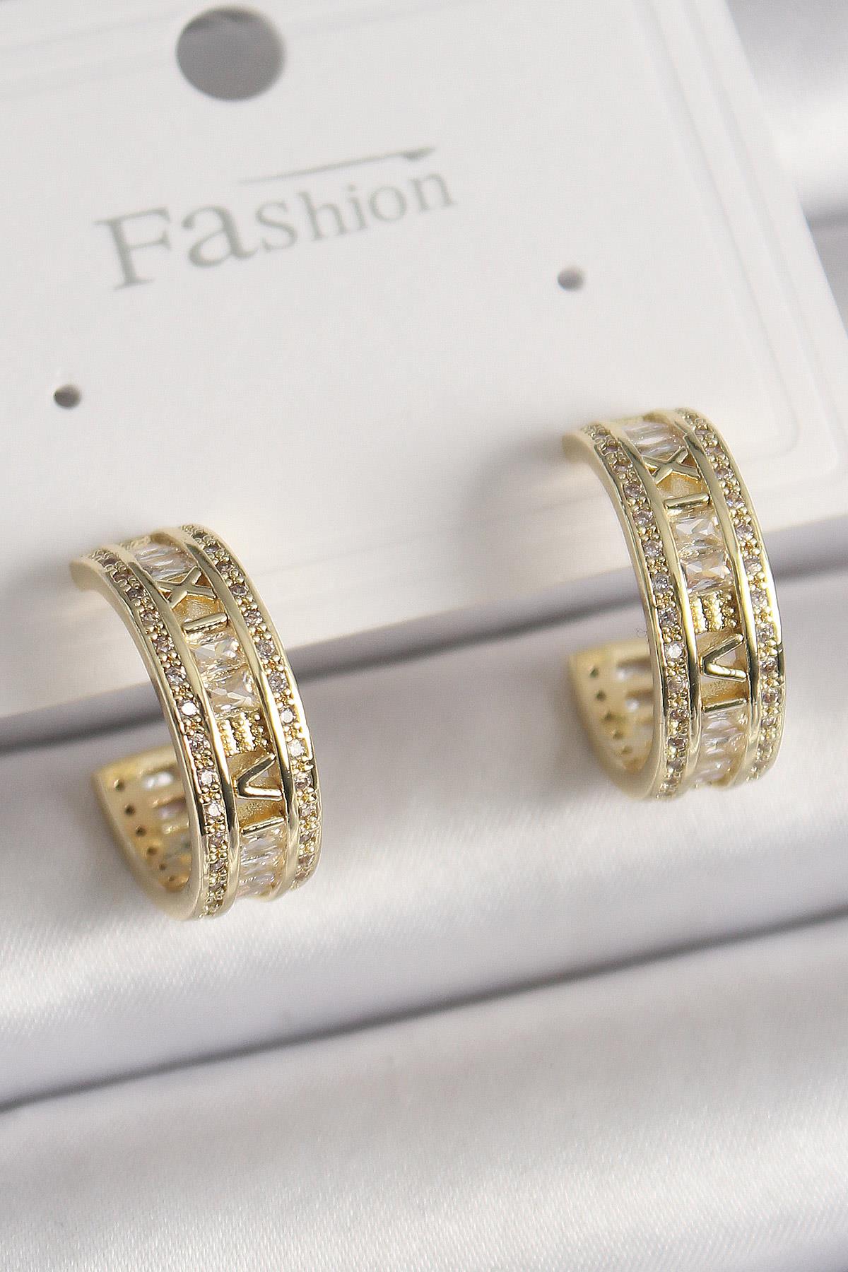 Pirinç Gold Renk Zirkon Taşlı İşleme Detay Halka Model Kadın Küpe