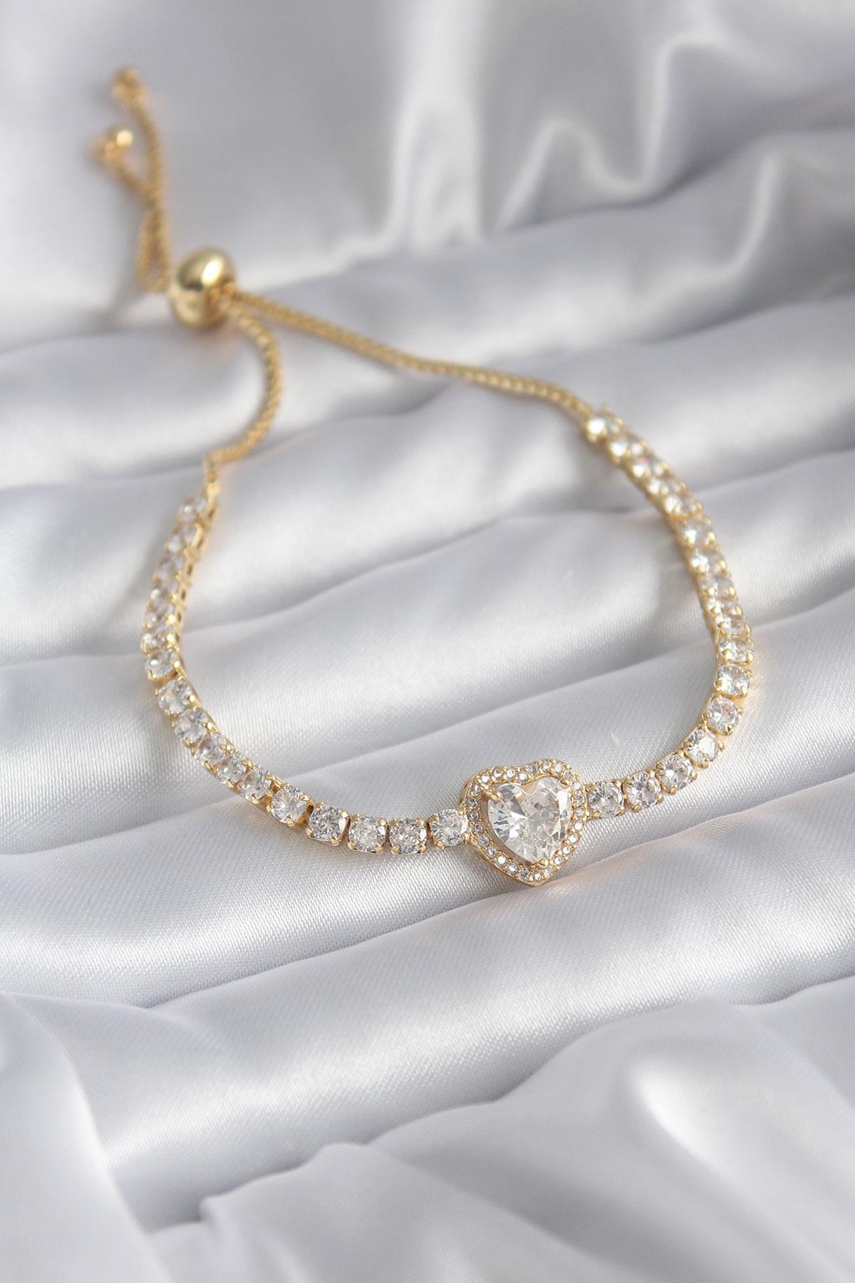 Pirinç Gold Renk Zirkon Taşlı Kalp Asansör Charm Model VIP Seri Kadın Bileklik